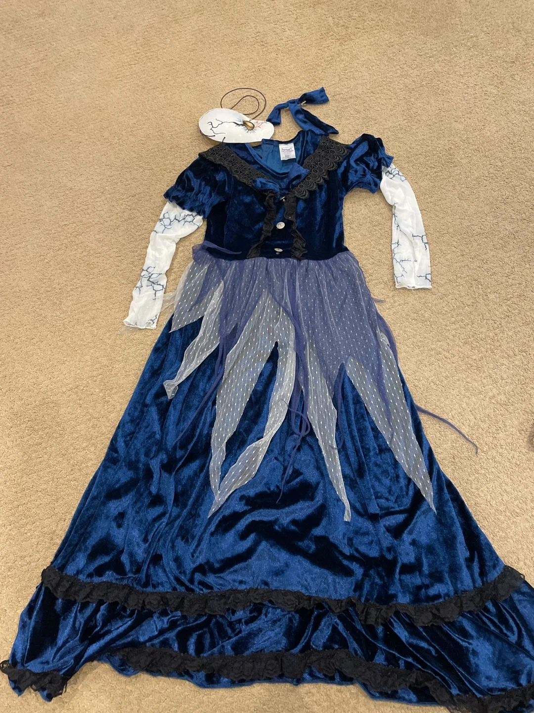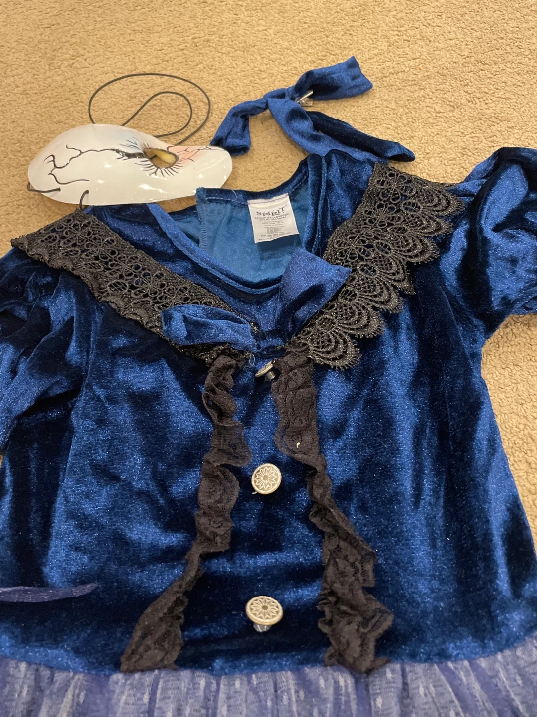 10Selling a gently used Spirit Halloween costume! It's a beautiful blue velvet dress with lace trim and comes with a matching mask. Perfect for Halloween or dress-up!