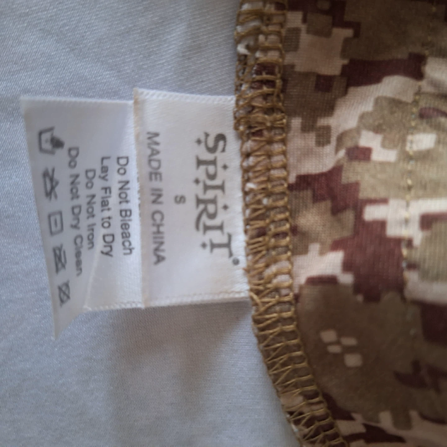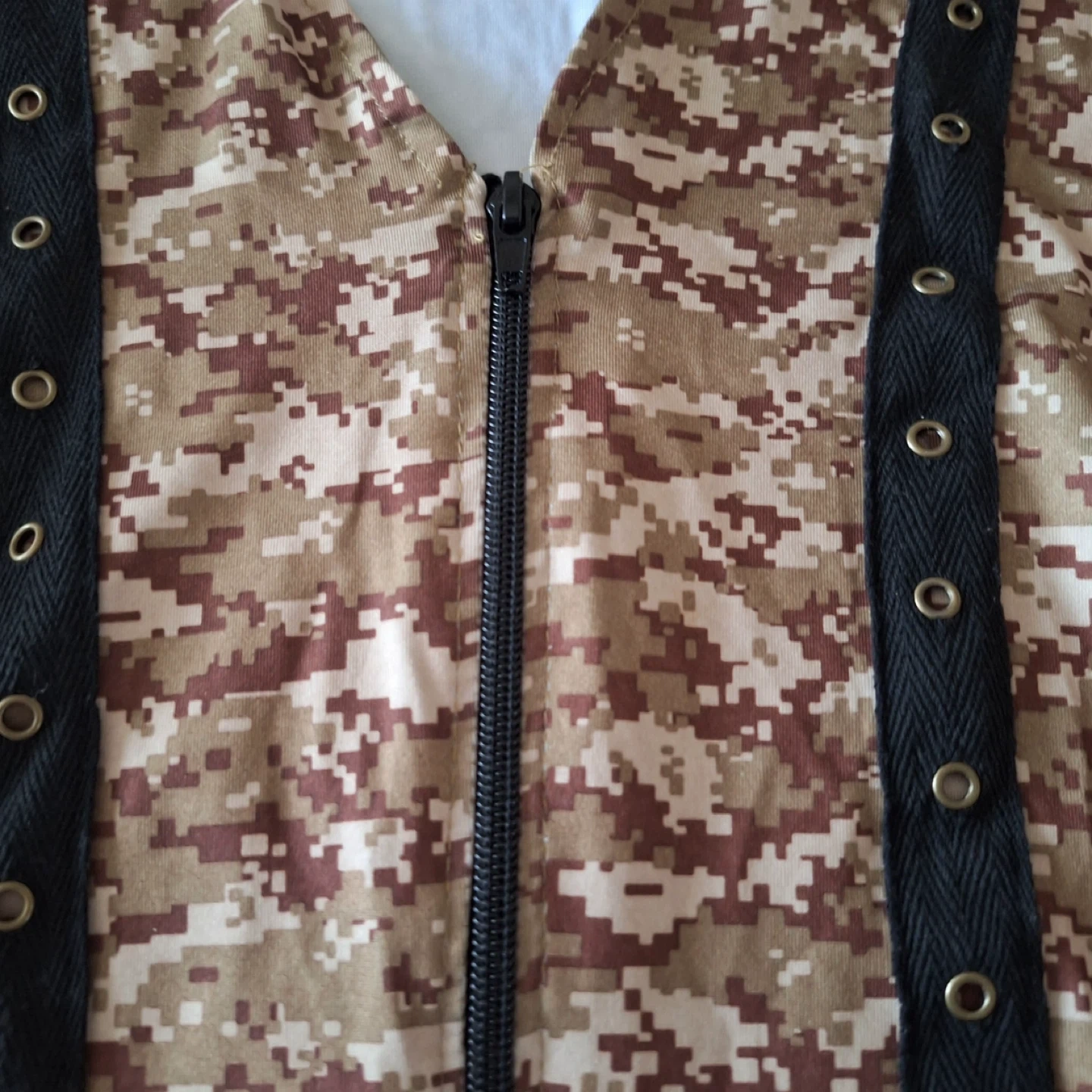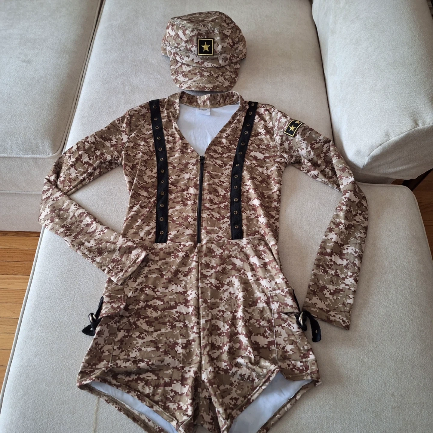 68Selling a Spirit Halloween costume featuring a camouflage pattern! Includes a jumpsuit and a hat. The costume has black accents and a zipper closure. Perfect for dress-up or Halloween!