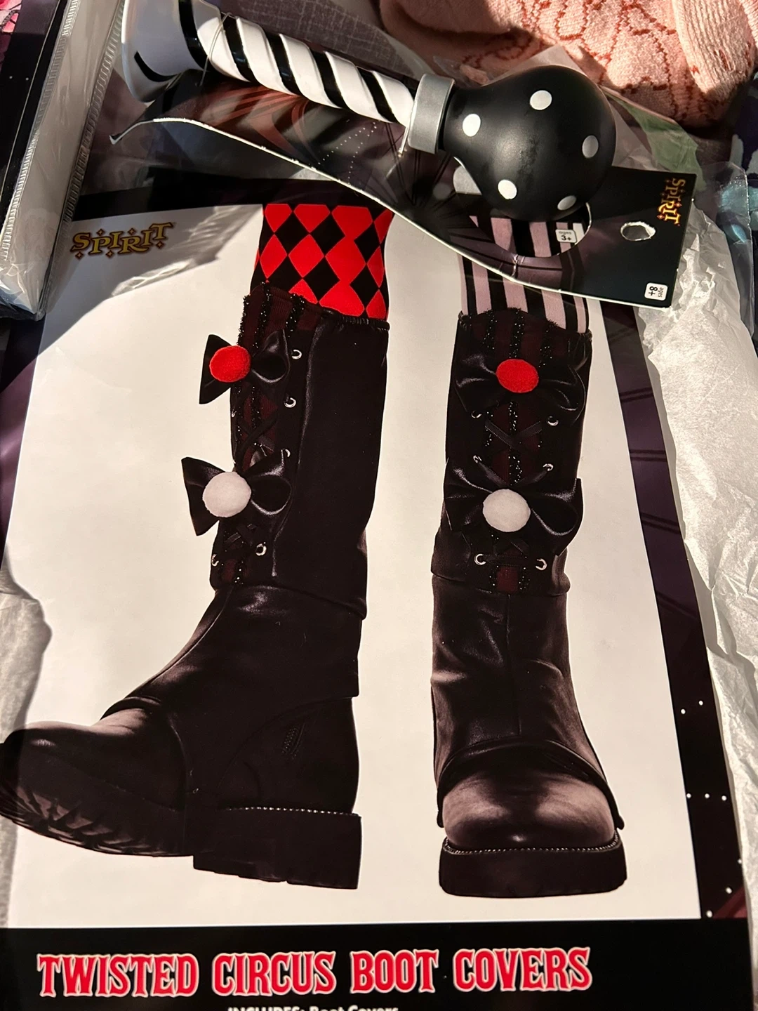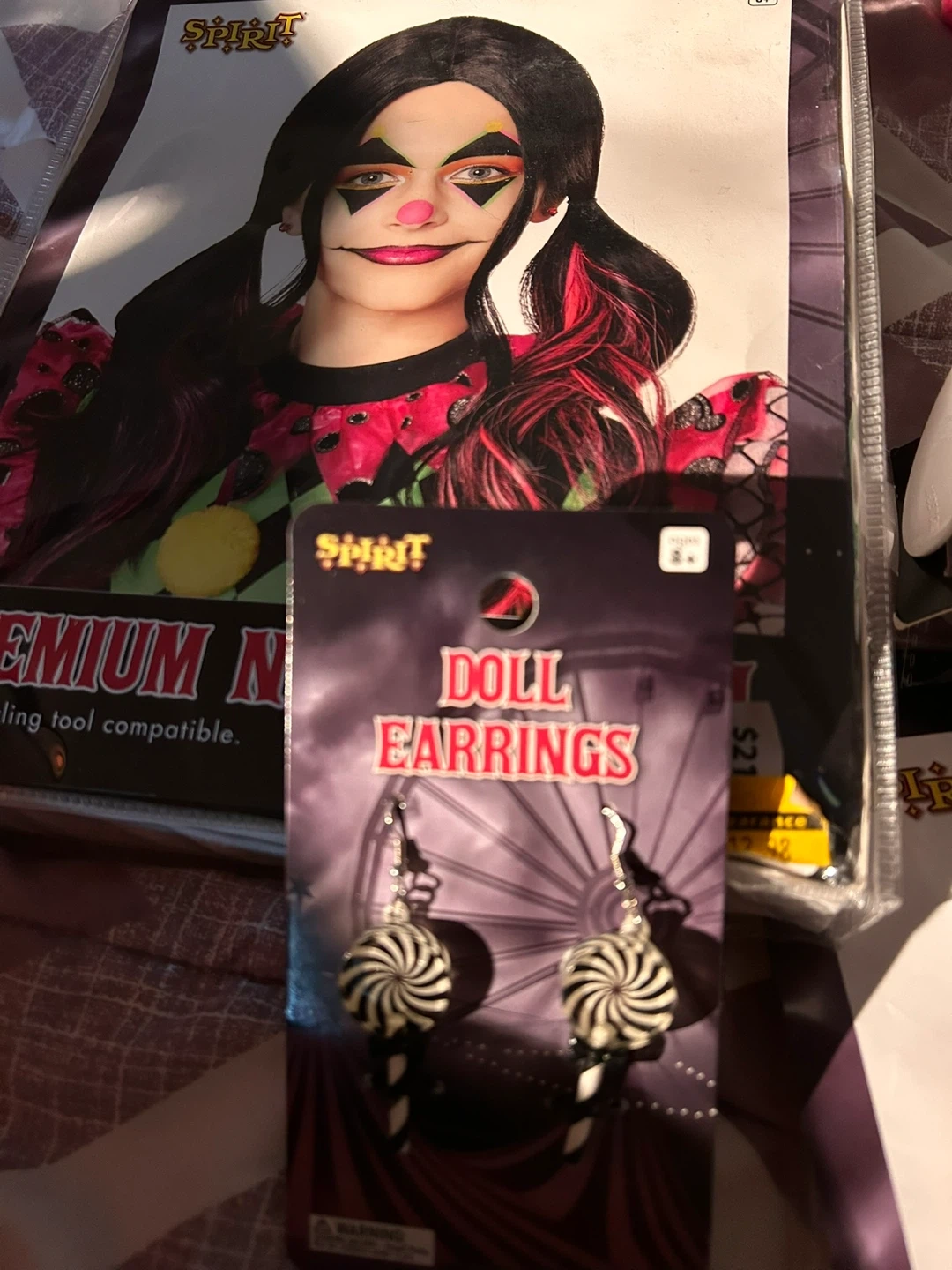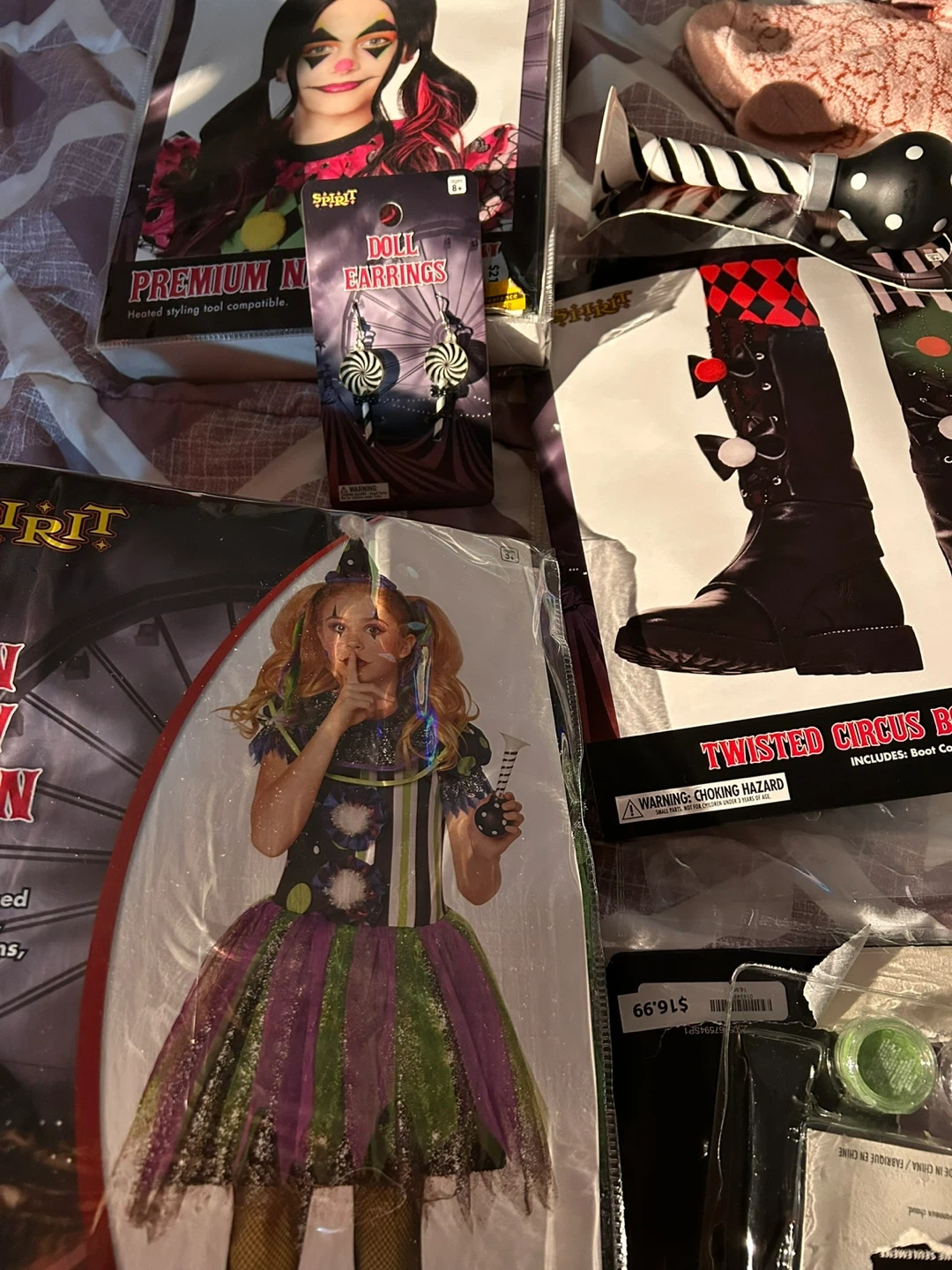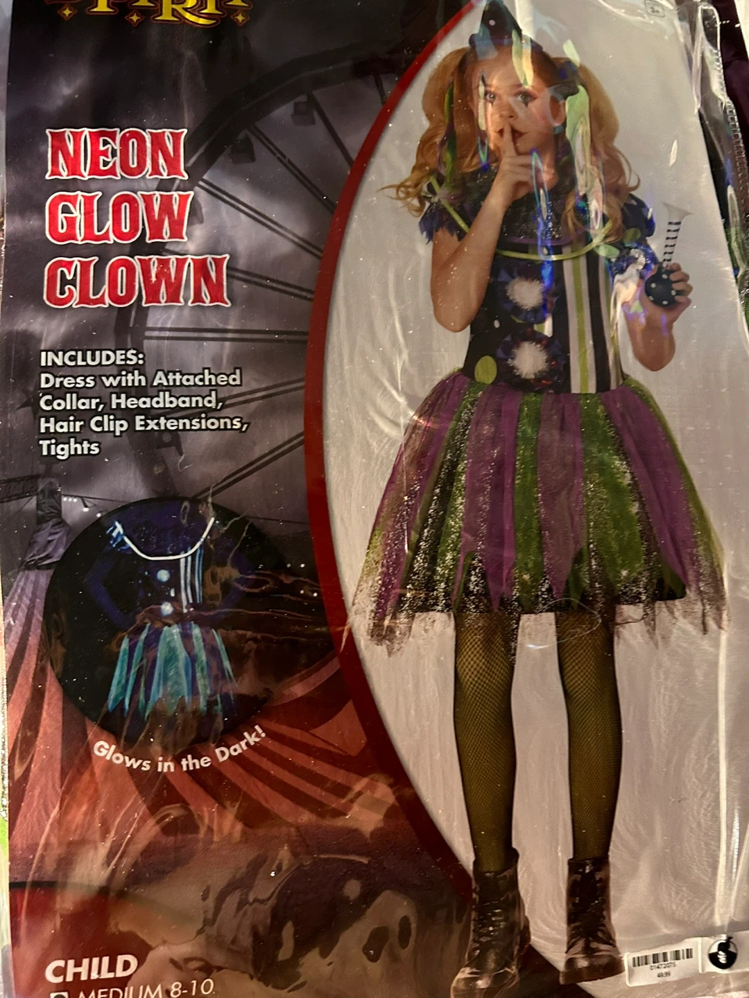 I have a few Spirit Halloween costumes and accessories for sale! - Neon Glow Clown: Includes dress with attached collar, headband, and tights. Child medium size 8-10. - Twisted Circus Boot Covers - Doll Earrings Extra items I bought not thinking it’s already in the package another set of tights for example. Granddaughter put it on but never used it. Spirit Halloween it’s going for $69.99