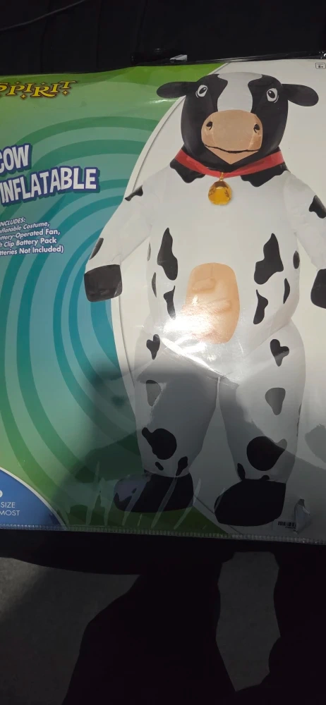10Get ready to moo-ve and groove with this hilarious cow inflatable costume from Spirit Halloween! It's in great condition and includes everything you need to become the life of the party: the inflatable costume itself, a fan to keep you inflated, and a clip battery pack (batteries not included). Adult size, one size fits most!