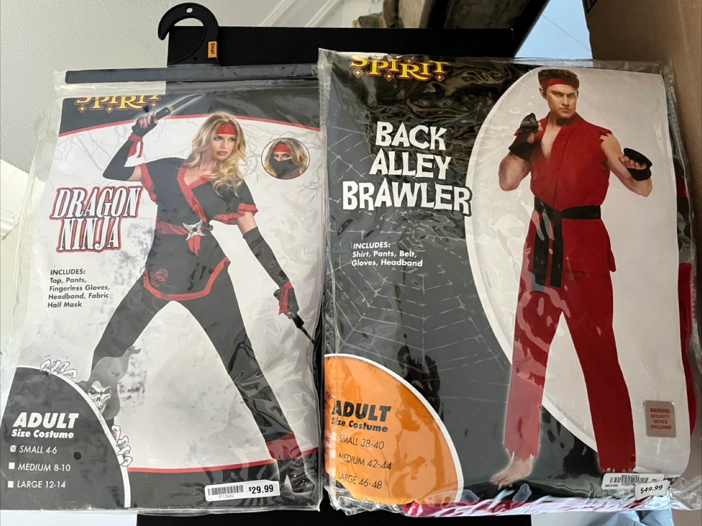 Selling two Spirit Halloween costumes! One is a Dragon Ninja costume that includes the top, pants, fingerless gloves, headband, and fabric half mask. The other is a Back Alley Brawler costume, which includes the shirt, pants, belt, gloves, and headband. Both are adult size.