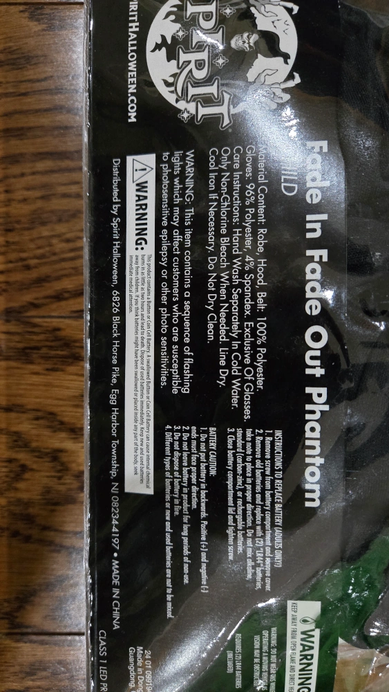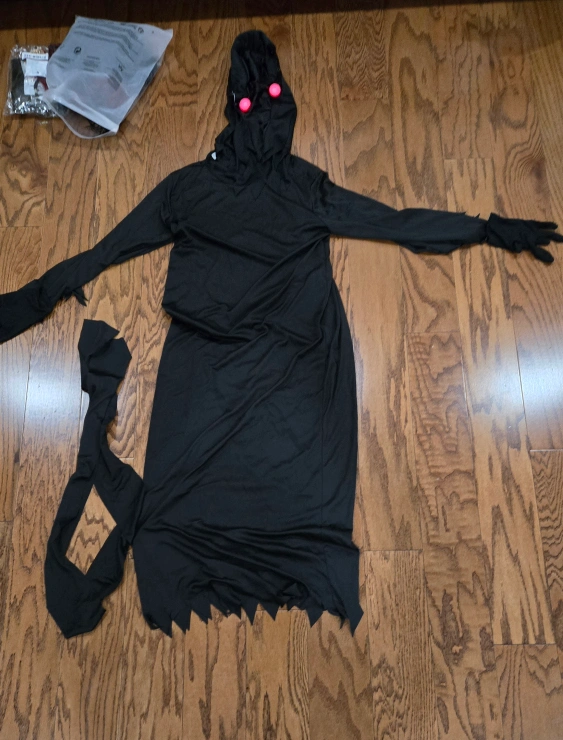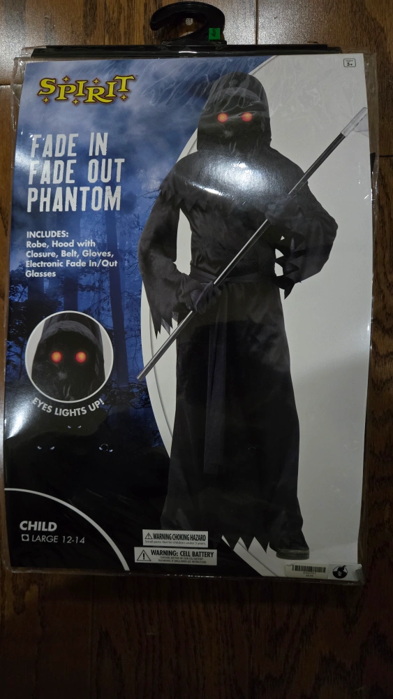 28Selling of Spirit Halloween Fade In Fade Out Phantom costume for a child, size large (12-14). It includes the robe, hood with closure, belt, gloves, and electronic fade in/out glasses.