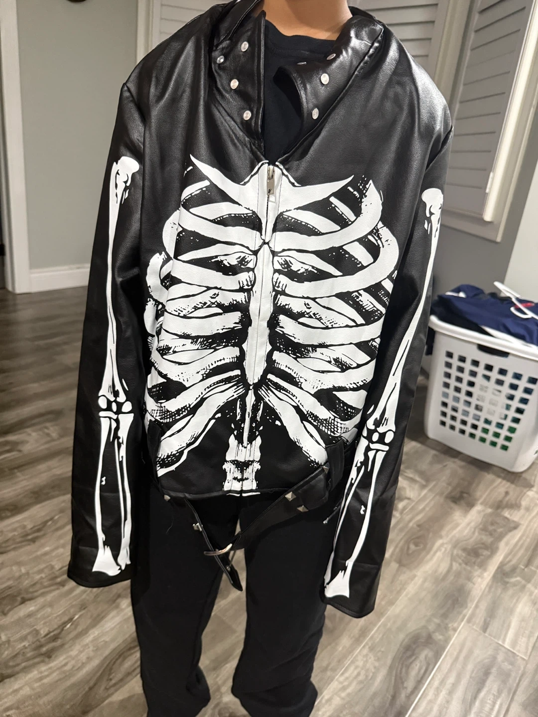 Selling a Spirit Halloween faux leather jacket with a skeleton design. It's a size M and in great shape! Perfect for Halloween or just adding a bit of edge to your wardrobe