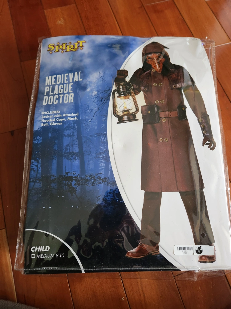 Get ready for Halloween with this Medieval Plague Doctor costume from Spirit Halloween! It's a child's size medium (8-10) and includes everything you need to complete the look: - Jacket with attached hooded cape - Mask - Belt - Gloves