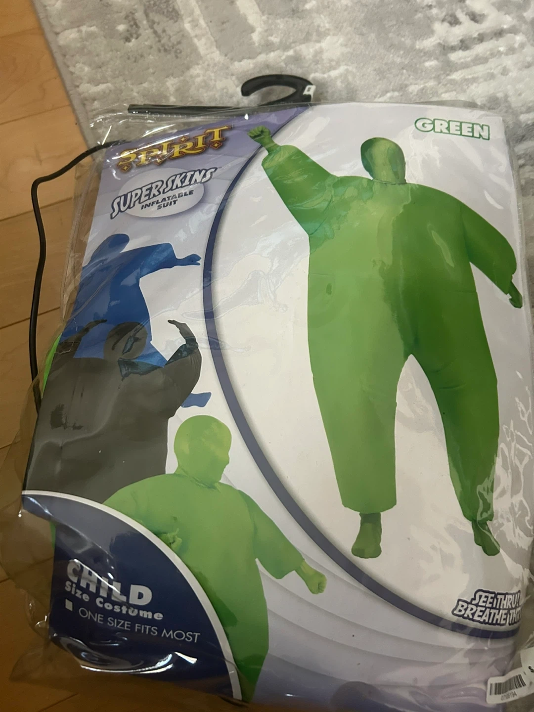 Get ready for Halloween with this fun inflatable suit! It's a child size costume from Spirit Halloween, and it says 'One Size Fits Most'. The package says 'Seethru! Breathe Thru!' Originally bought for $44.99