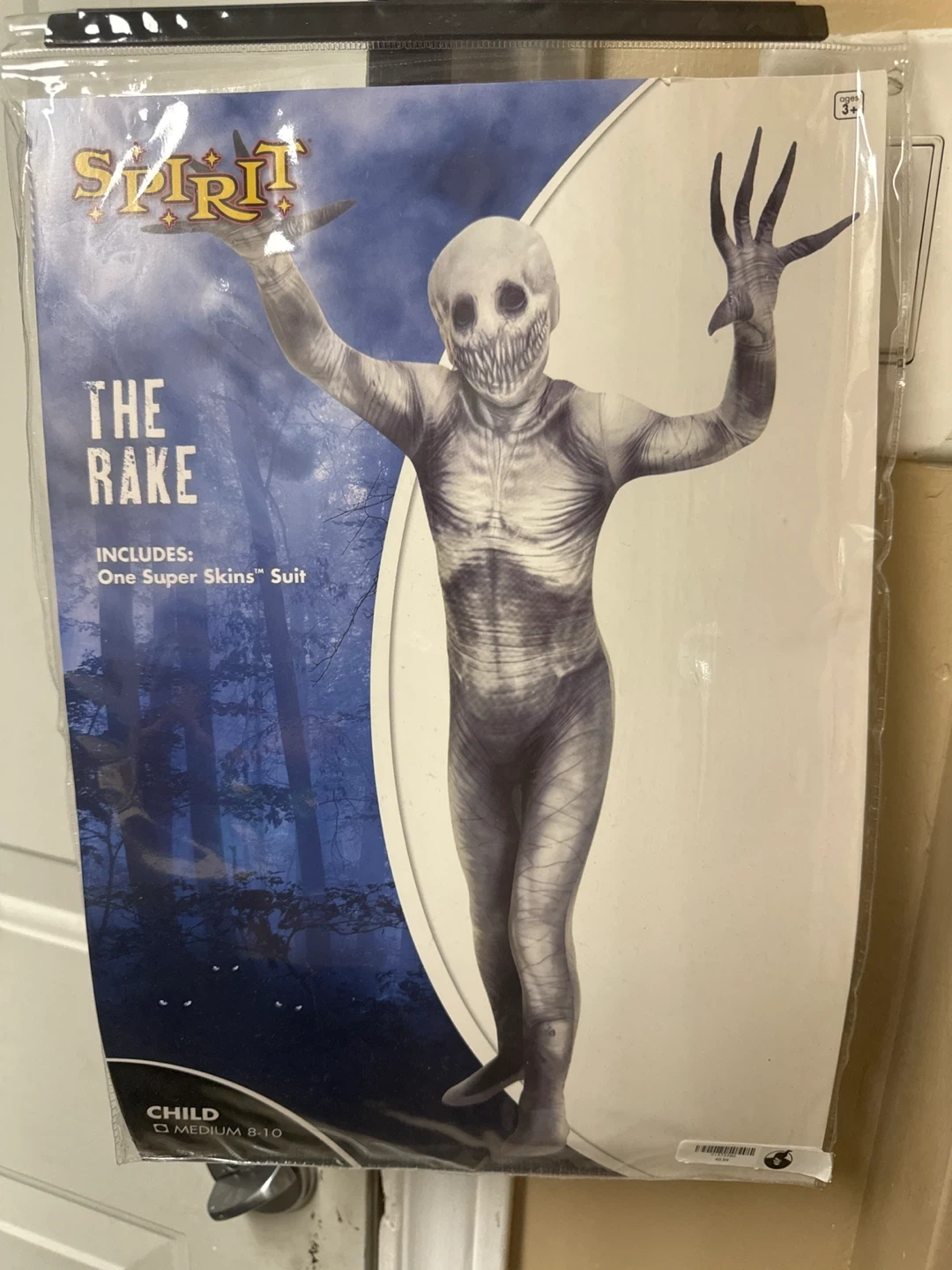 Selling a Spirit Halloween 'The Rake' costume. It's a child's size medium, fitting sizes 8-10. Includes one Super Skins suit. Perfect for Halloween!