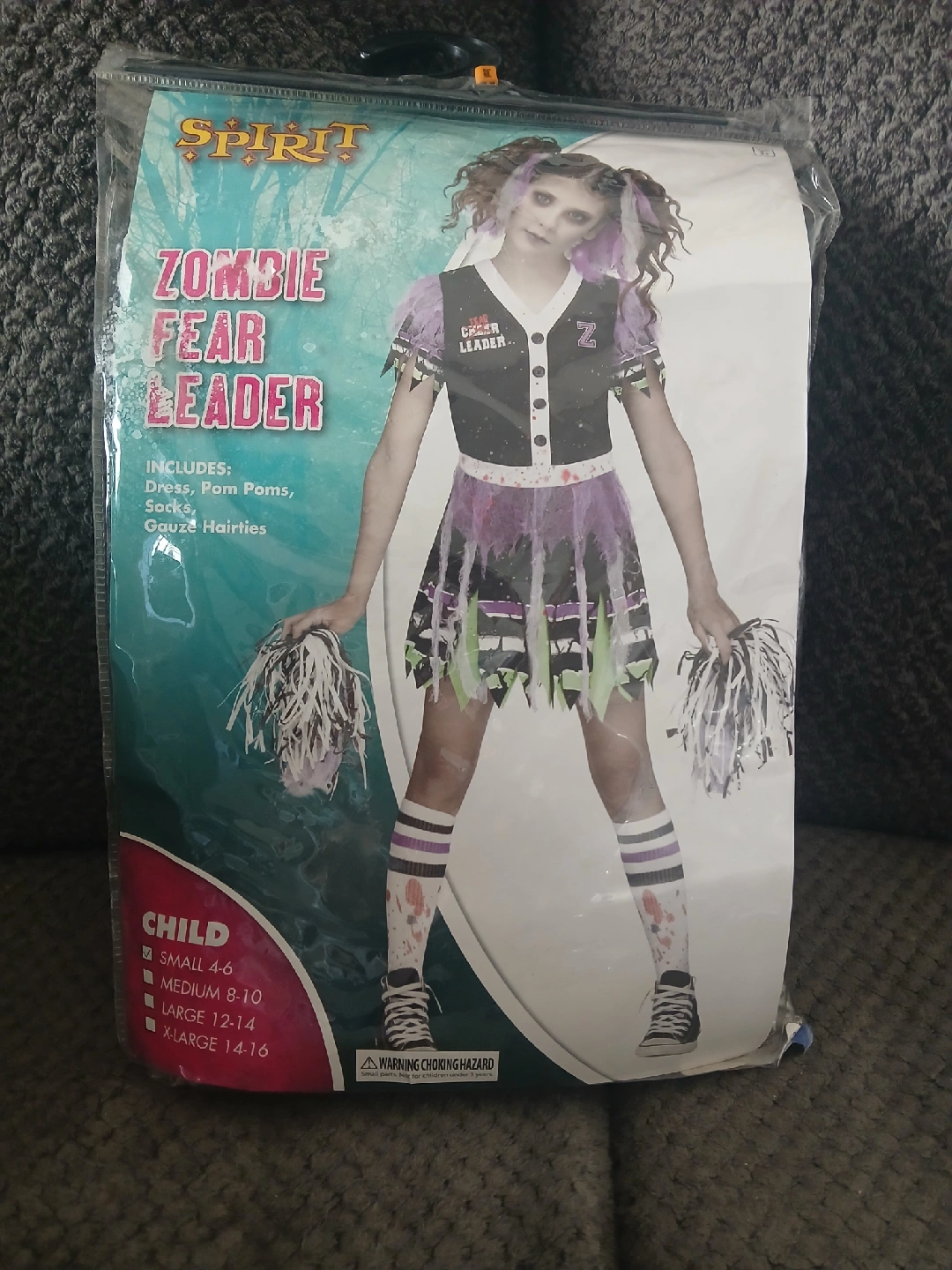 Selling a Spirit Halloween Zombie Fear Leader costume for kids! It's a child size small (4-6) and includes the dress, pom poms, socks, and gauze hair ties