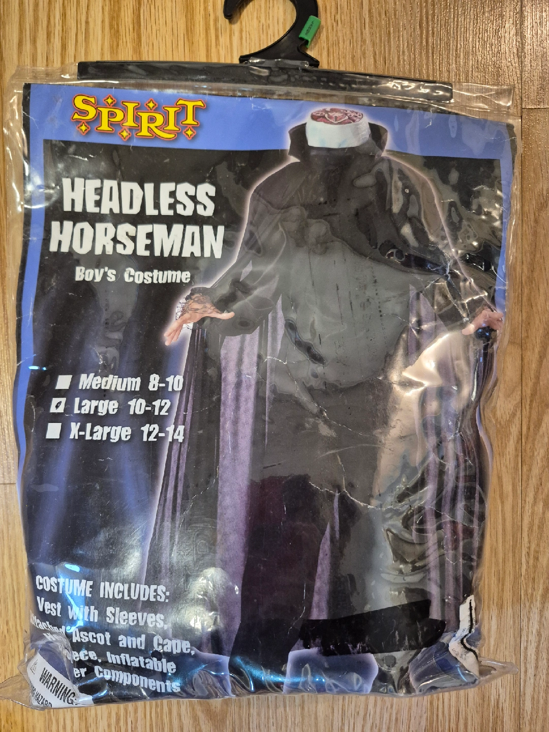 Get ready for Halloween with this Spirit Headless Horseman costume for boys! It's a size Large (10-12) and includes everything you need to complete the look: a vest with sleeves, an attached ascot and cape, a headpiece, and inflatable shoulder components BRAND NEW KIDS HALLOWEEN COSTUME "HEADLESS HORSEMAN" size LARGE(10-12)
