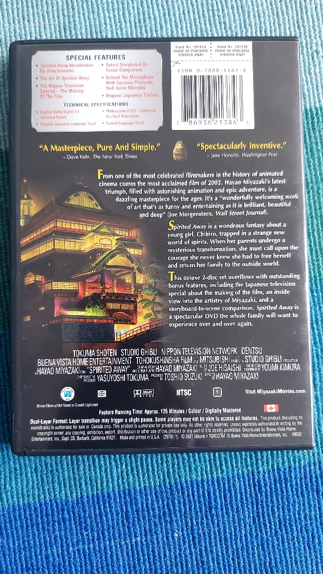 24Selling a DVD of Miyazaki's 'Spirited Away'! This is a Studio Ghibli film, a masterpiece from the acclaimed filmmaker. Enjoy this wondrous story of Chihiro's journey in the spirit world. A must-see for animation lovers! No scratches or fingerprints / 2 disc