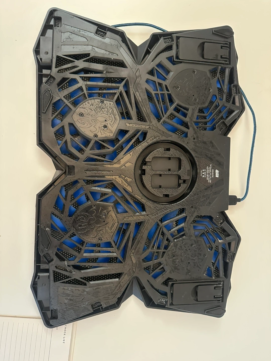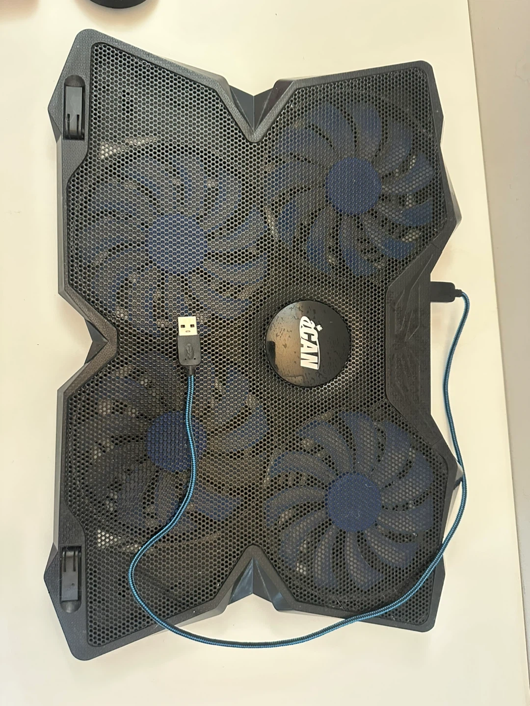 This All in One laptop cooling pad features four blue fans to keep your device cool. It's powered by USB and made of durable plastic. A great addition for gamers or heavy laptop users!