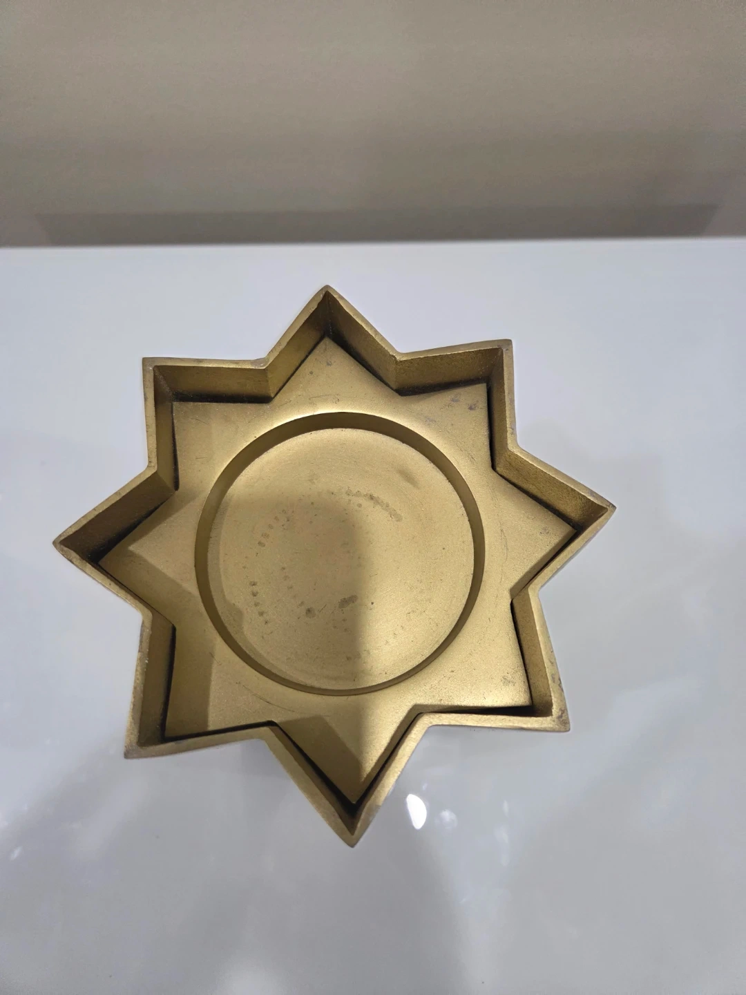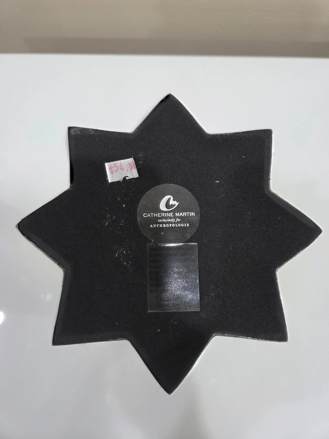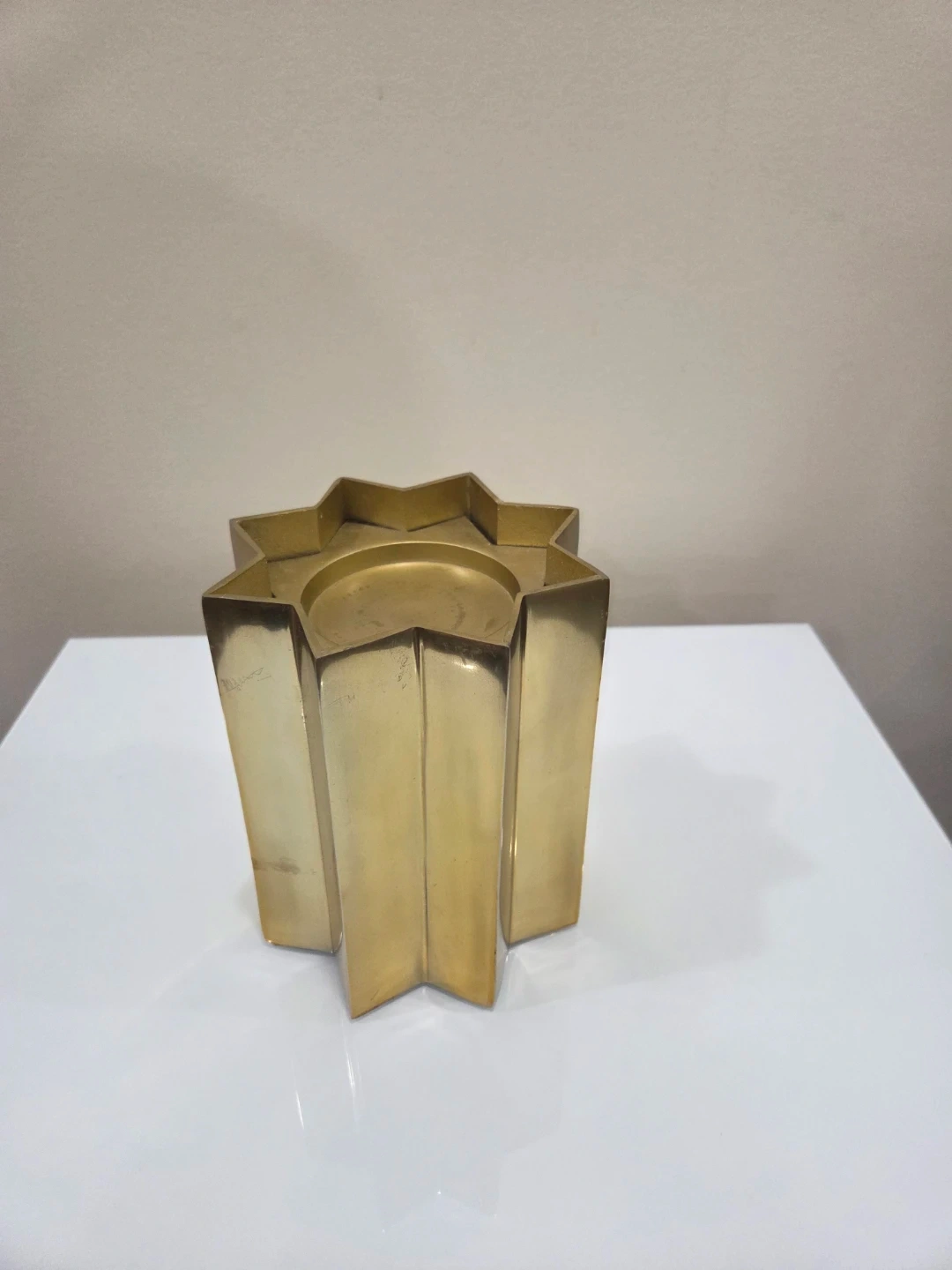 This brass candle holder has a unique star shape. It's designed by Catherine Martin for Anthropologie. Measures 6 inches tall and 6 inches in diameter.