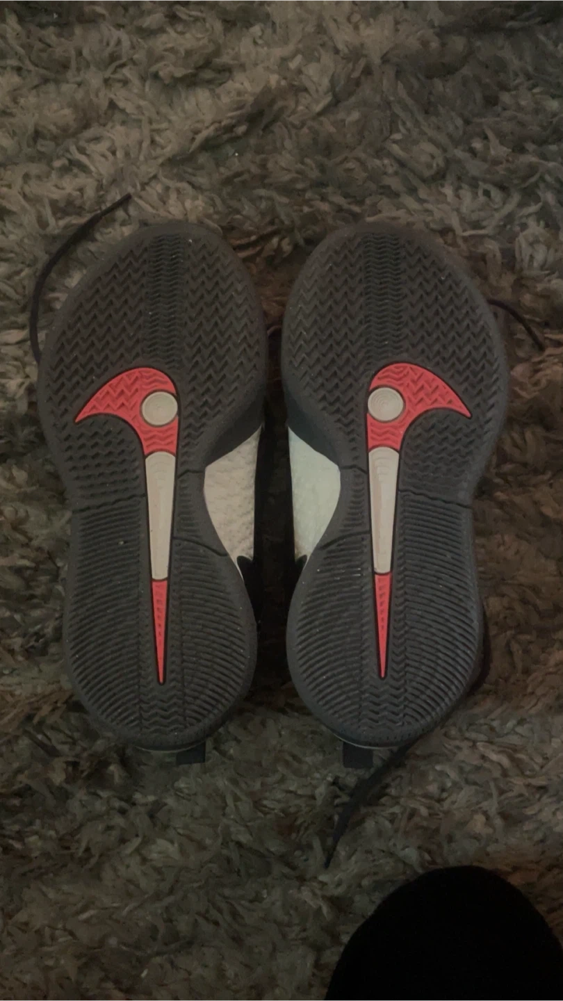 These Nike basketball shoes are black and white. They feature a lace-up closure and rubber soles for grip. Great for playing hoops!