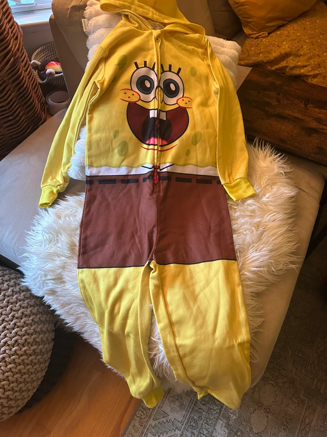65Cozy Spongebob character onesie, perfect for lounging around the house or a fun costume party! It features Spongebob's face on the front and a hood for extra warmth. The onesie is in good condition and ready for a new home. Says size medium. Fits 10-12yo. Pick up North Poco