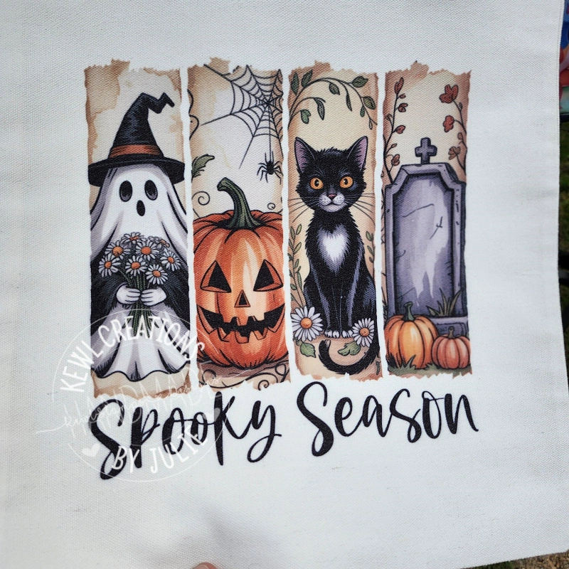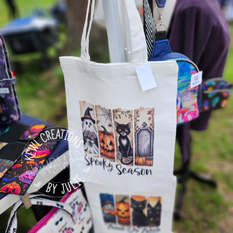 This is a cute tote bag with a spooky season design, perfect for carrying your essentials or for trick-or-treating. note this item is handmade and might have some imperfections.