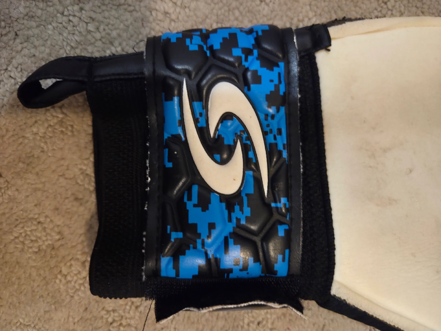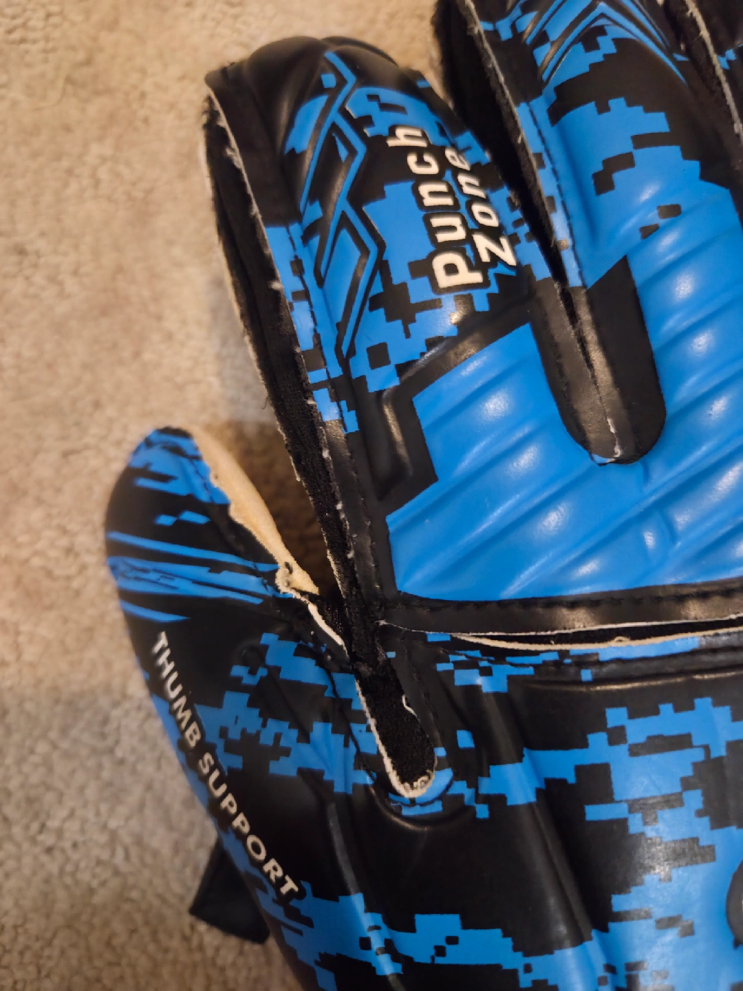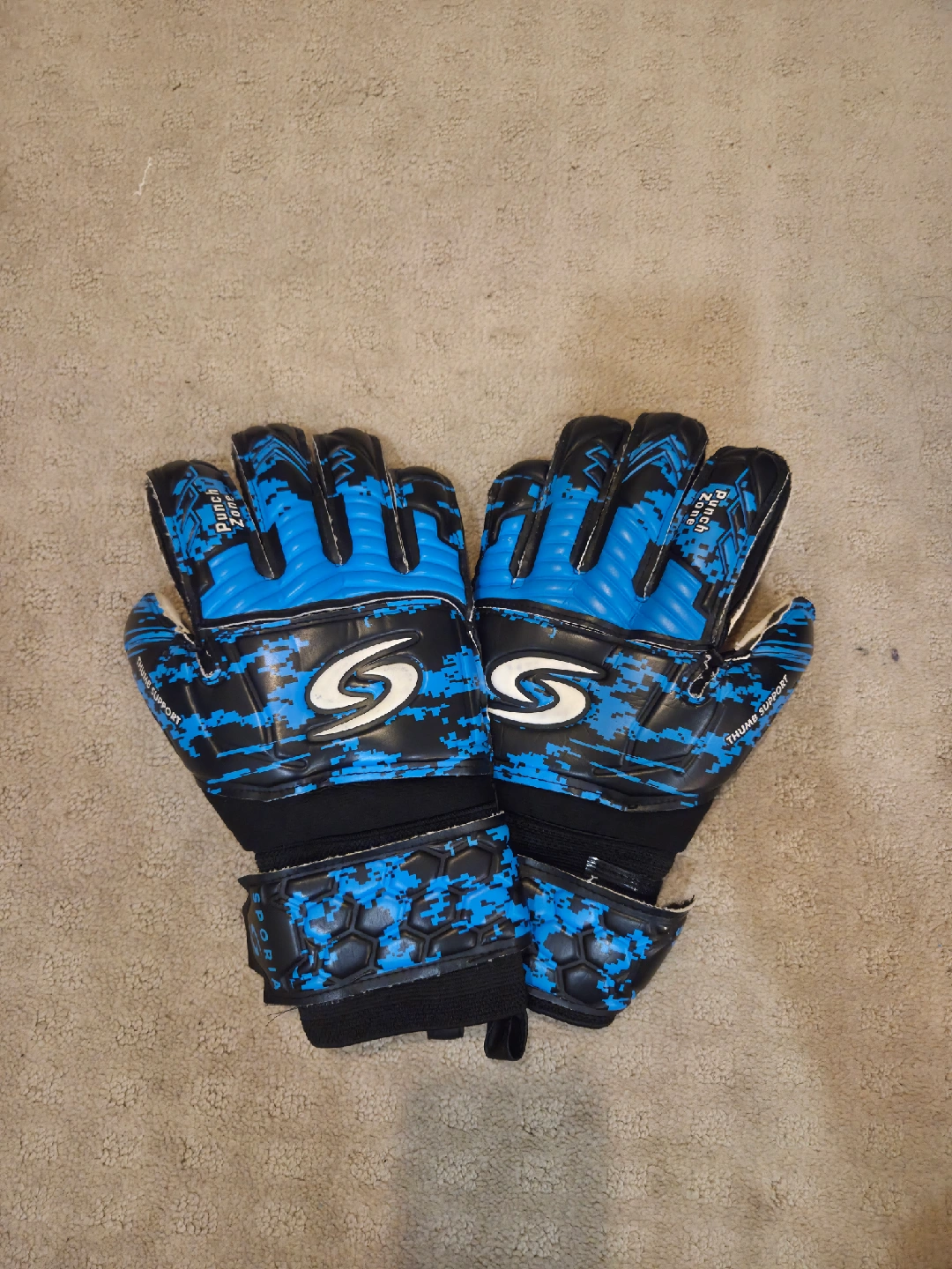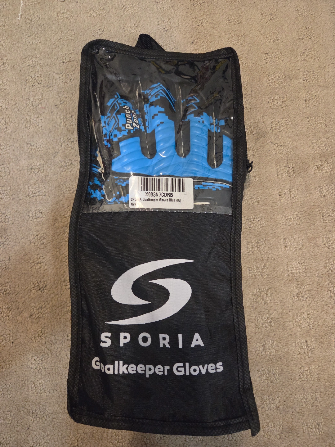 Selling a pair of Sporia Goalkeeper Gloves in blue. They feature punch zone and thumb support. Comes with glove bag. It fits mostly anyone, specifically teenagers. It only has minor scratches on the front but won't affect gameplay. Barely used.
