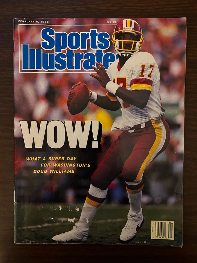 44Own a piece of sports history with this February 8, 1988 issue of Sports Illustrated, featuring Doug Williams after Washington's Super Bowl XXII victory! This magazine is in good condition considering its age, showing only minor wear and tear. A must-have for any football fan or collector. * **Issue Date:** February 8, 1988 * **Cover Subject:** Doug Williams, Washington Redskins * **Super Bowl:** Super Bowl XXII Looking for a unique gift or a personal keepsake? This vintage magazine is a fantastic choice! Cash only
