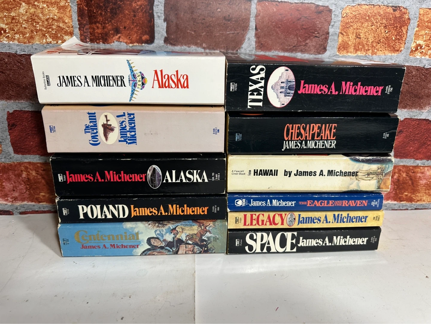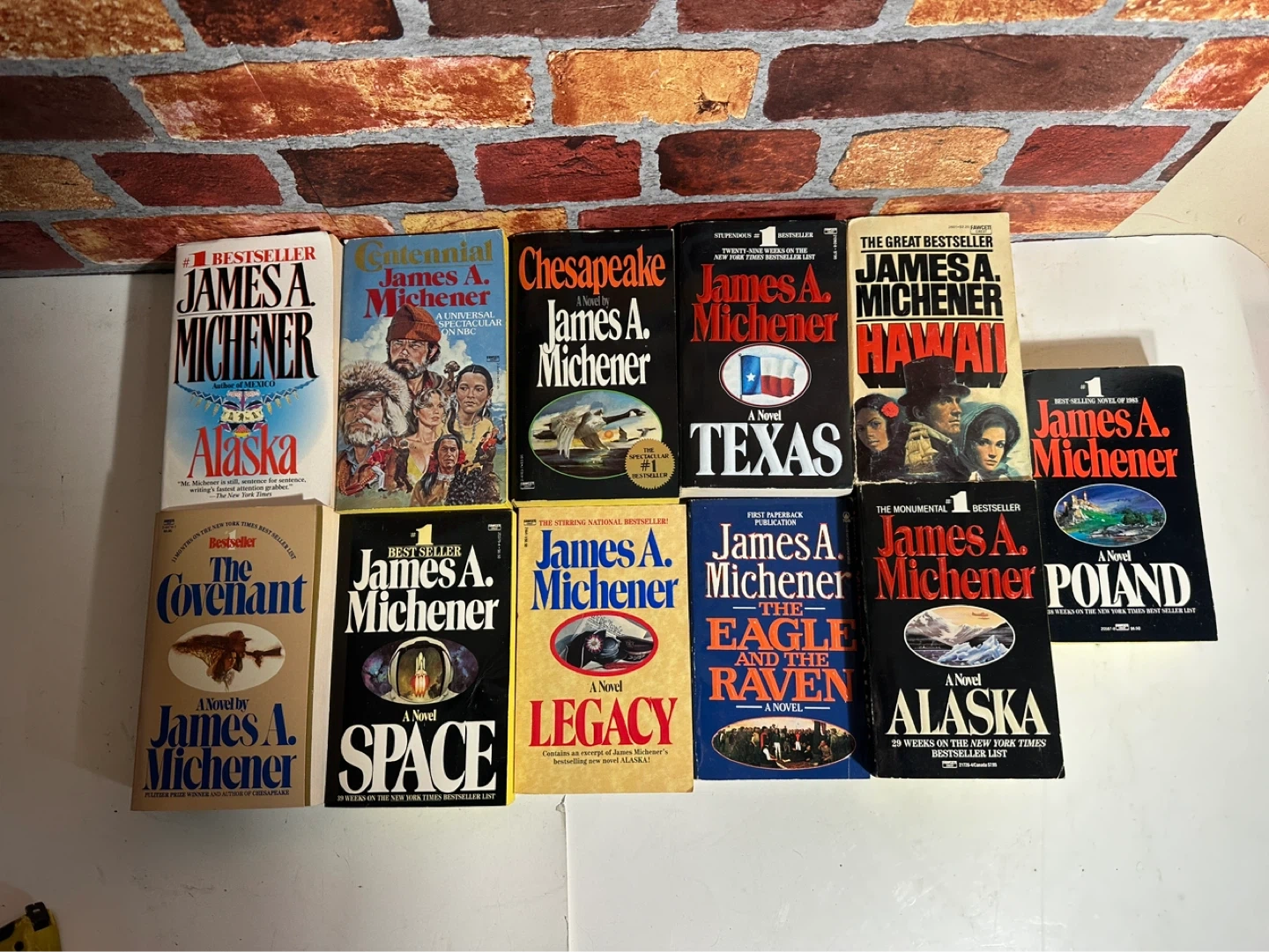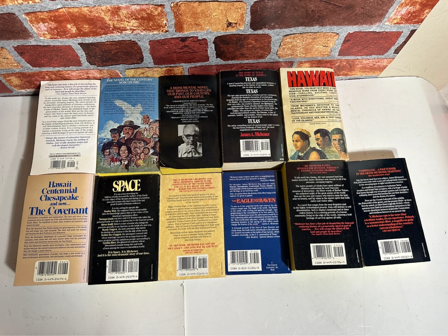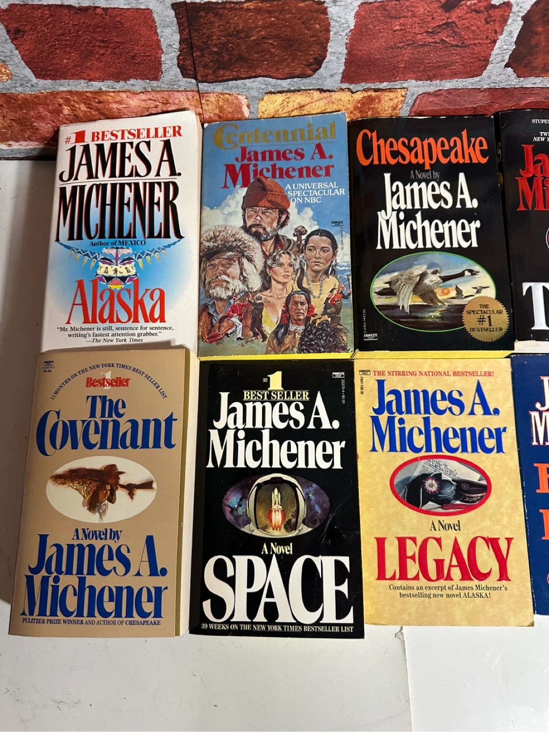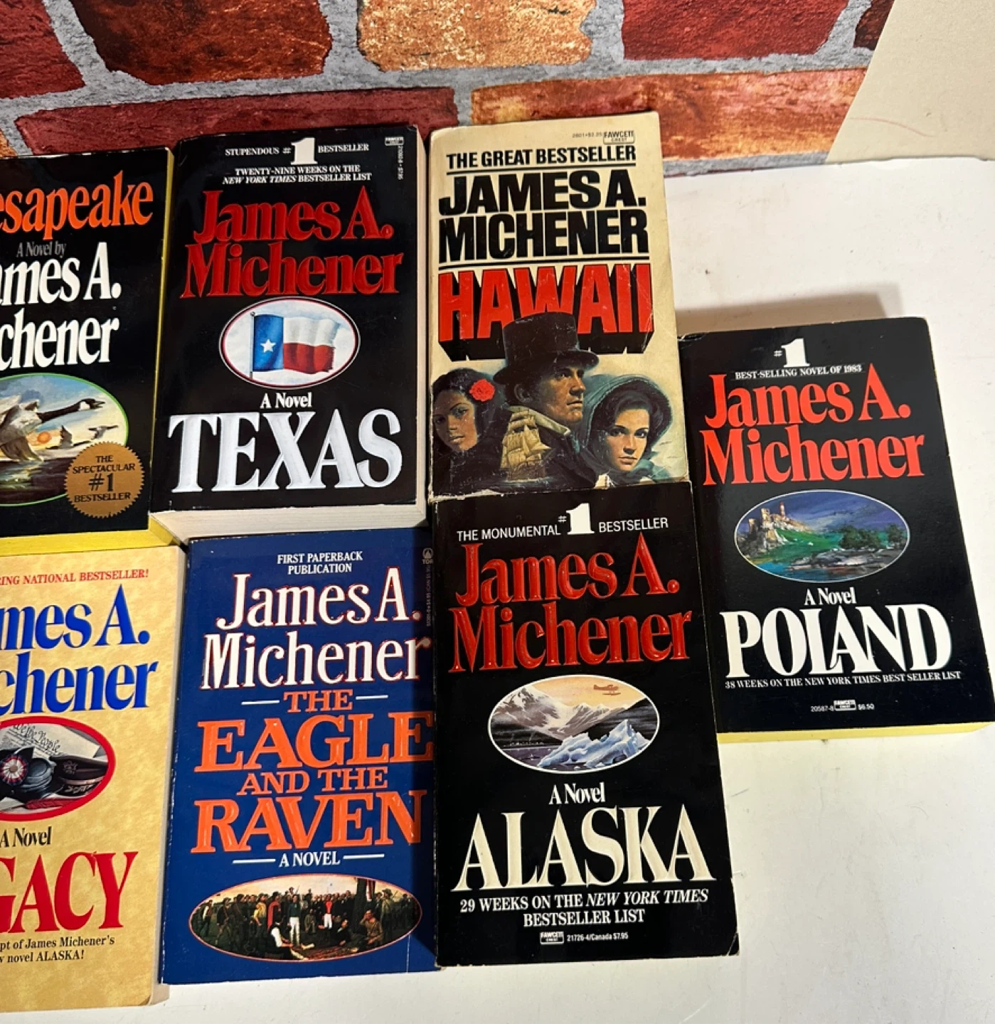 A collection of novels by James A. Michener, including titles like Alaska, Centennial, Chesapeake, Texas, Hawaii, Poland, Space, Legacy, The Covenant, and The Eagle and the Raven. These are paperback editions of historical and epic fiction.