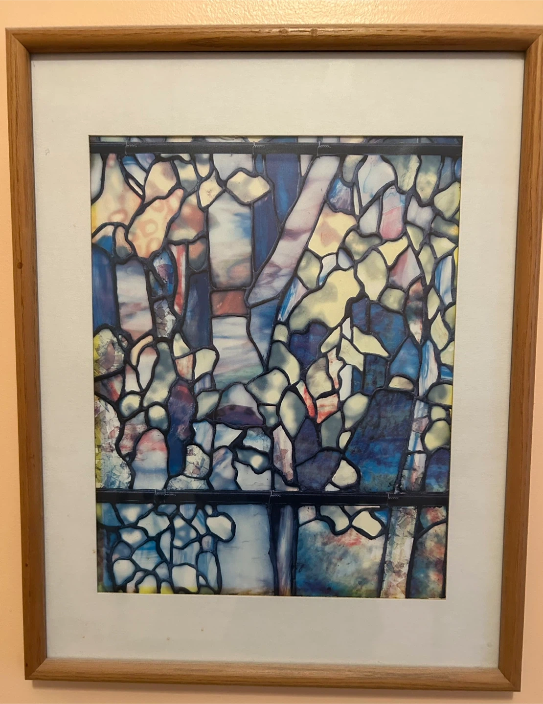 Tiffany Window print. The artwork has a mosaic-like pattern with blues, yellows, and pinks. It's housed in a simple wooden frame.