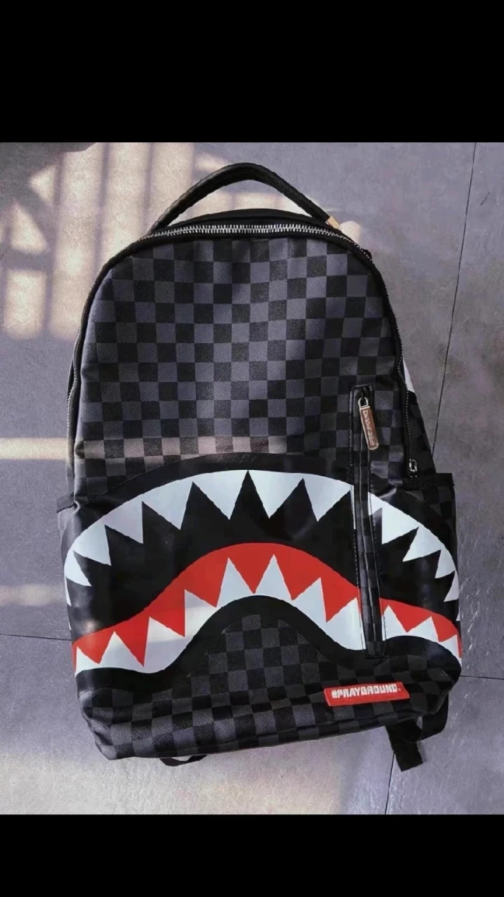 Selling a Sprayground backpack with a distinctive shark mouth design! It has a checkered pattern. Perfect for school or travel