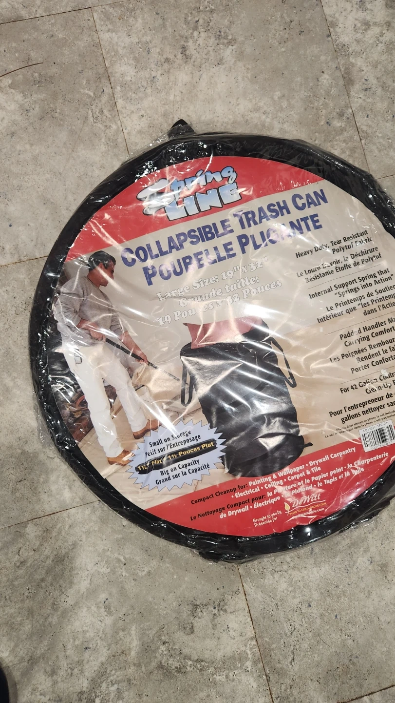 65Selling a brand new Spring Line Collapsible Trash Can. It's a large size, 19" x 32", and has a capacity of 19 Pou/Poces/Inches. It's heavy duty and tear-resistant, perfect for painting, wallpapering, and drywall carpentry. This compact cleanup solution is great for electrical work too! It also has padded handles for comfortable carrying
