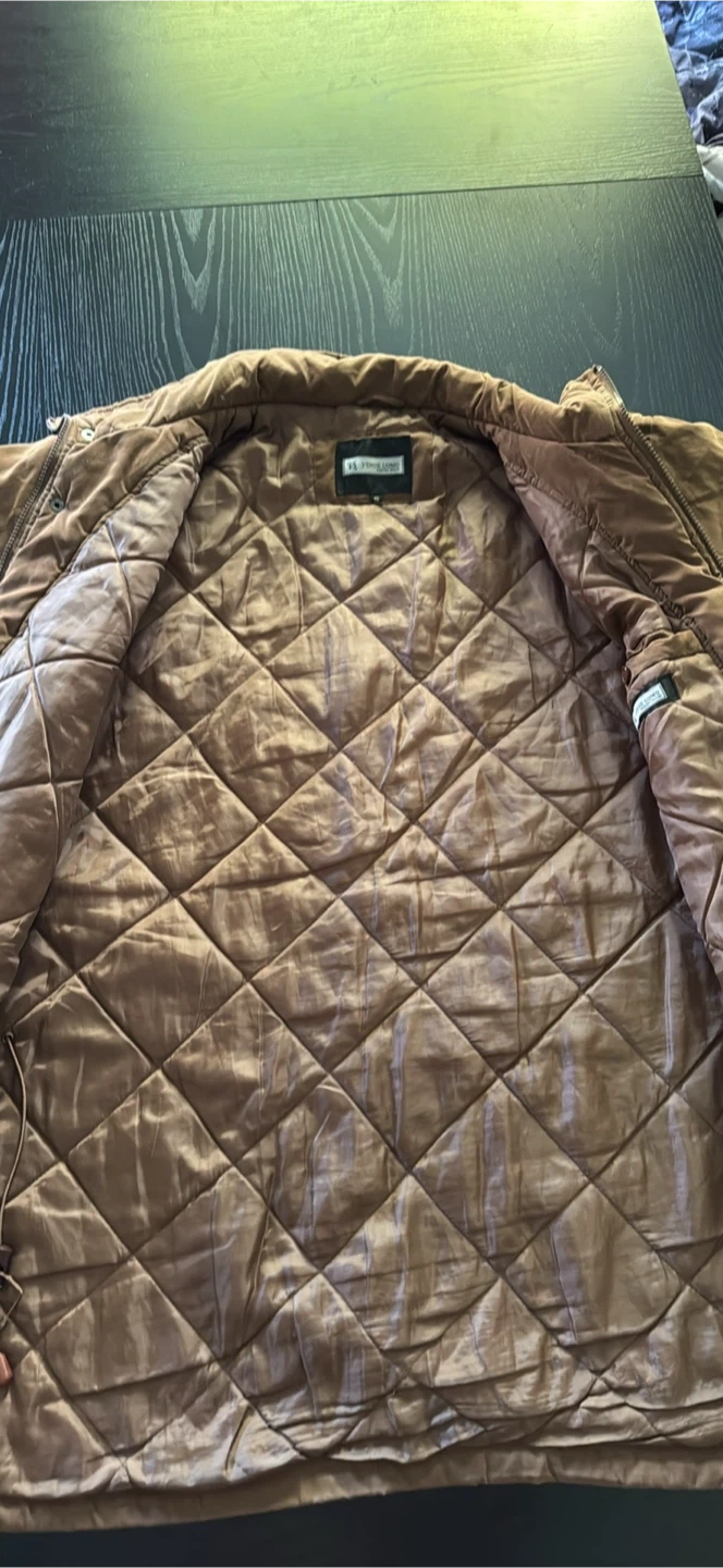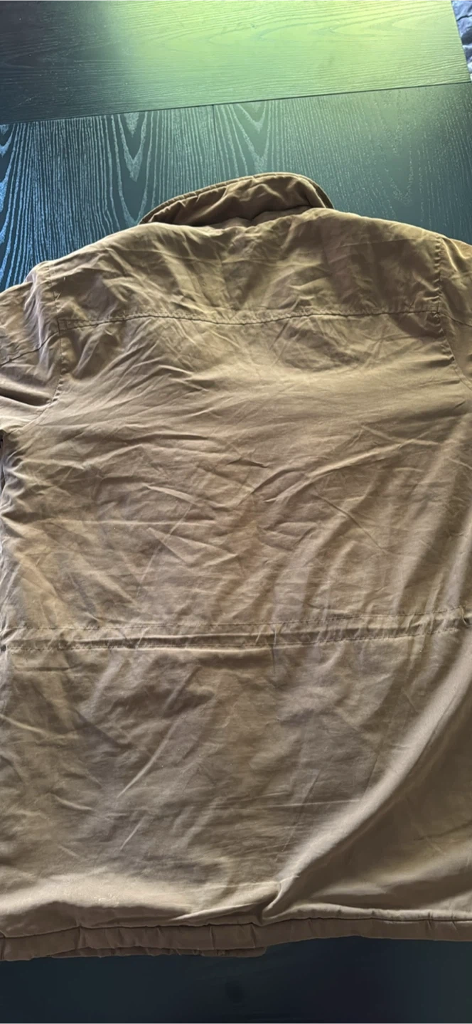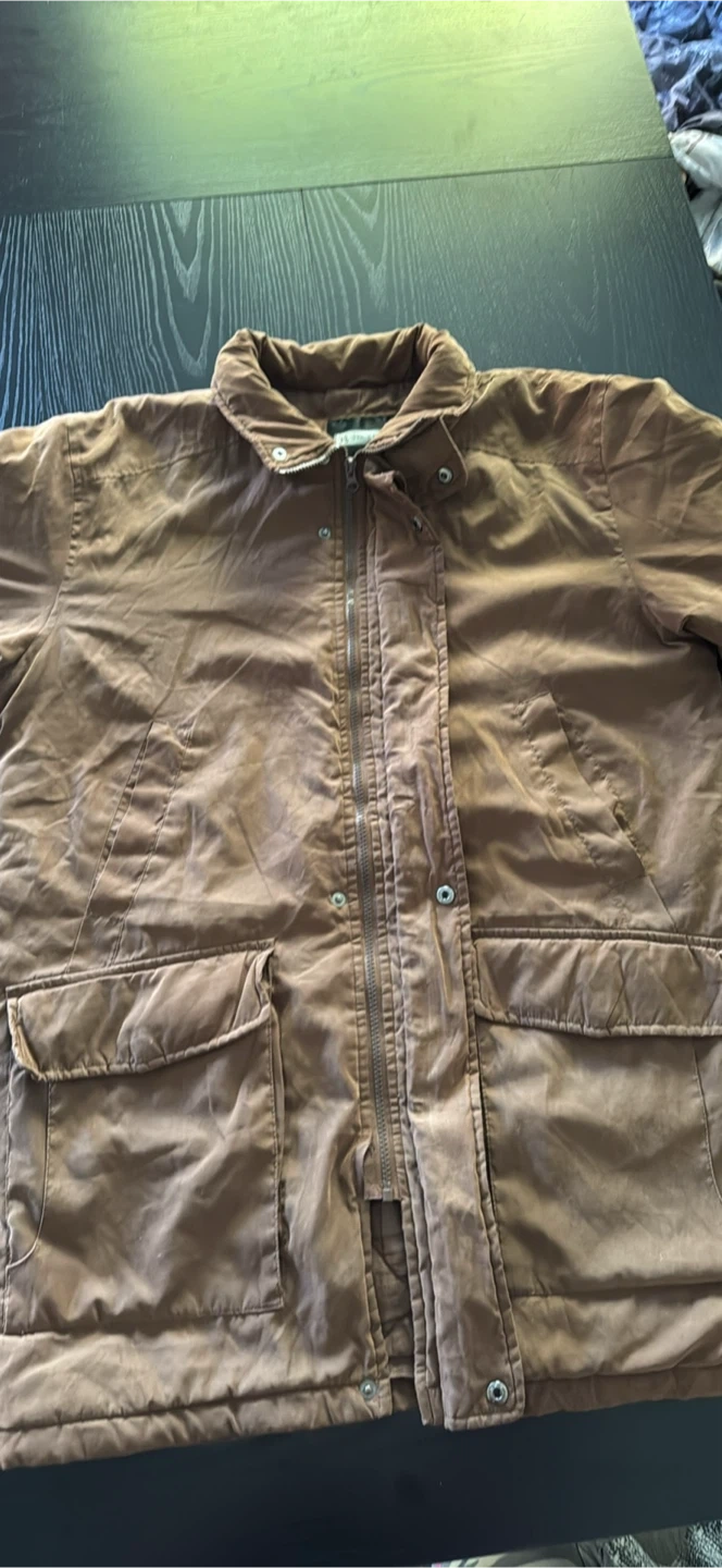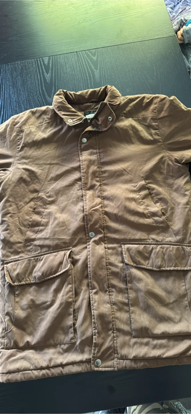 10Selling a brown jacket from Spring London. It features a zipper and button closure. The jacket has four pockets on the front and a quilted lining. It's perfect for keeping warm on cooler days!