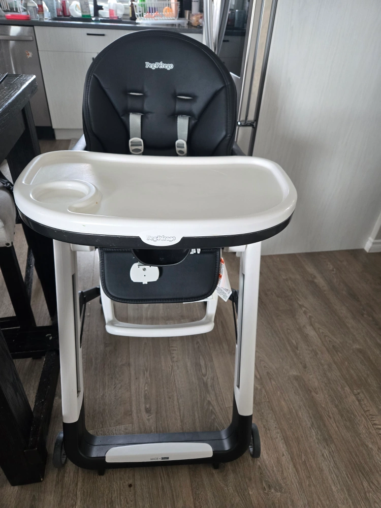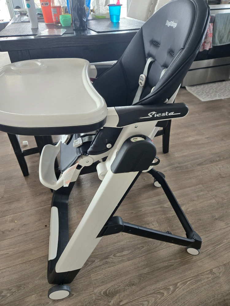 Foldable high chair. Black faux leather seat. Five-point harness. Tray included. Wheels for mobility and they lock for safety.