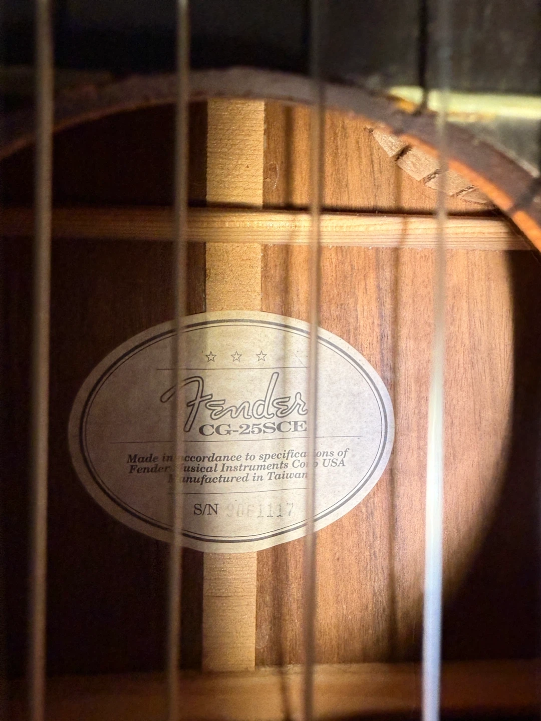 Fender CG-25SCE acoustic-electric guitar. Made in Taiwan. Includes hardshell case. Features a cutaway design. This limited addition nylon-string guitar is ready for your music!