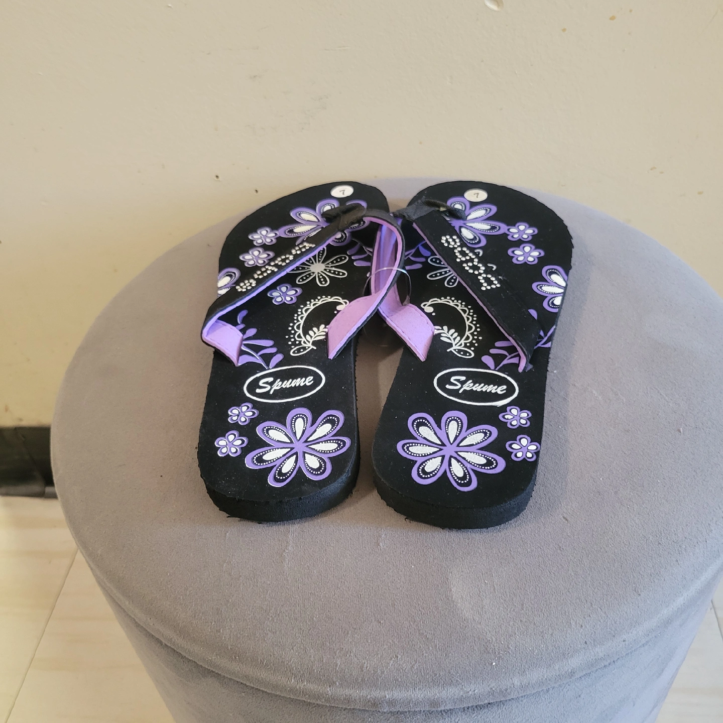 Cute pair of Spume flip flops in a size 7! They're black with a fun purple and white floral design. Perfect for summer!