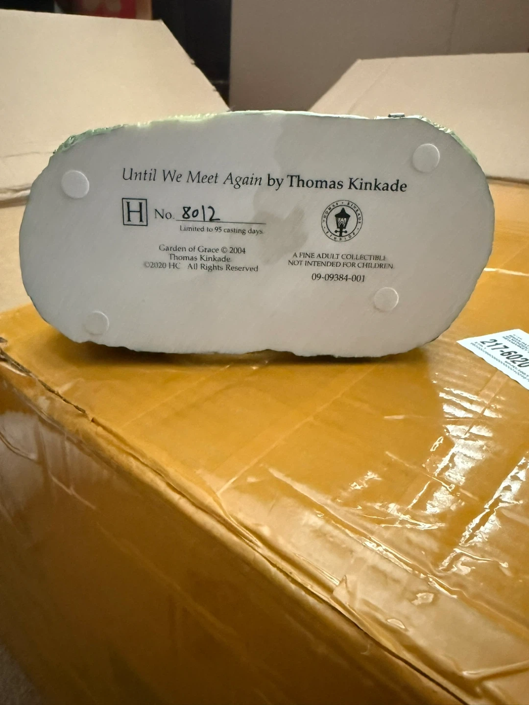 A Thomas Kinkade "Until We Meet Again" limited edition figurine, #8012. This collectible depicts a bench with cardinals and a memorial message. Garden of Grace collection from 2004.