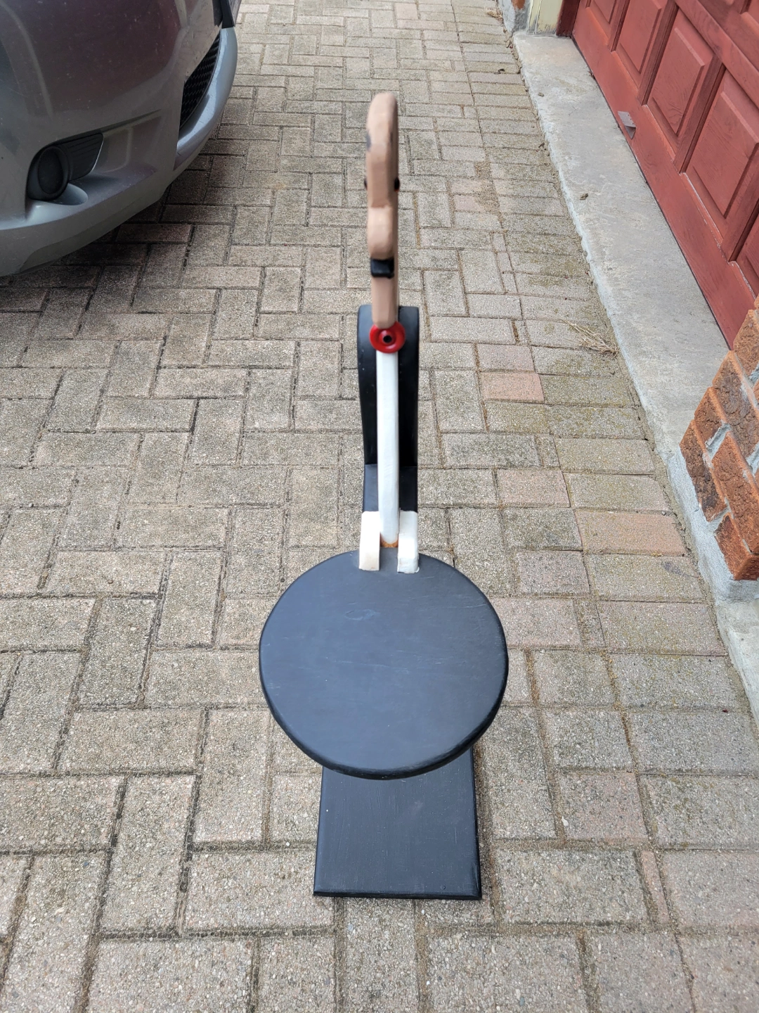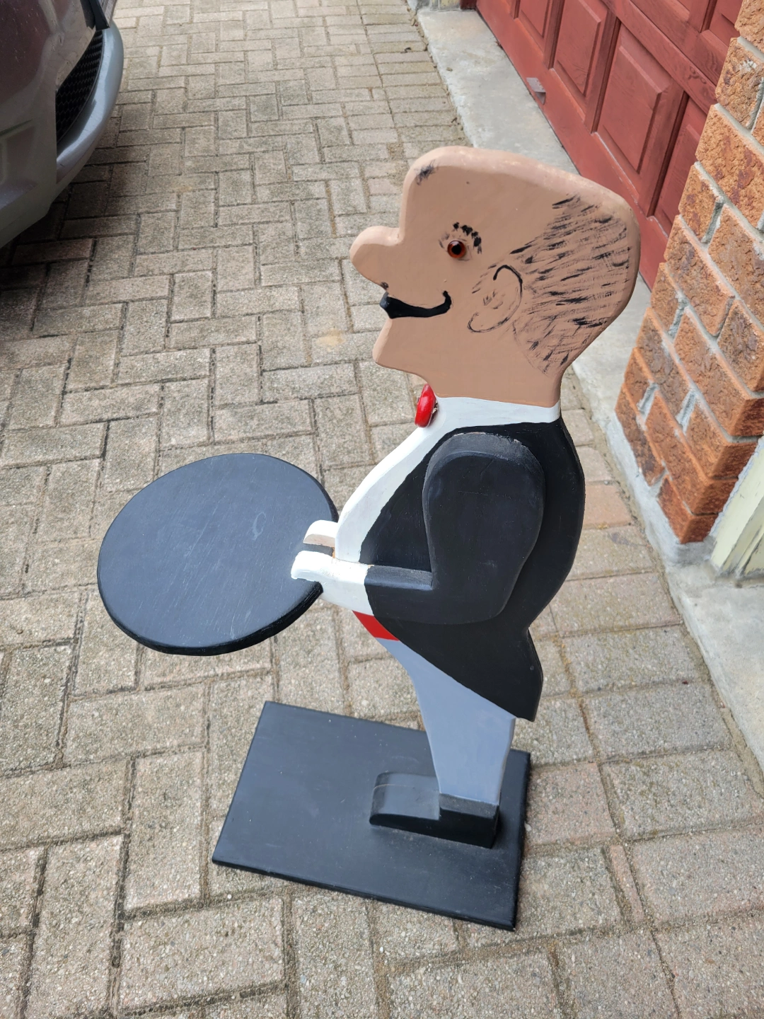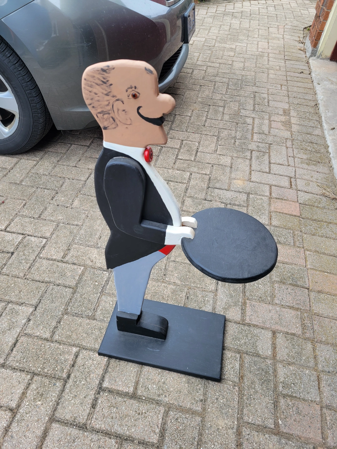 Hand-painted wooden butler figurine. Serves as a side table. Features a round black top. Great conversation piece.