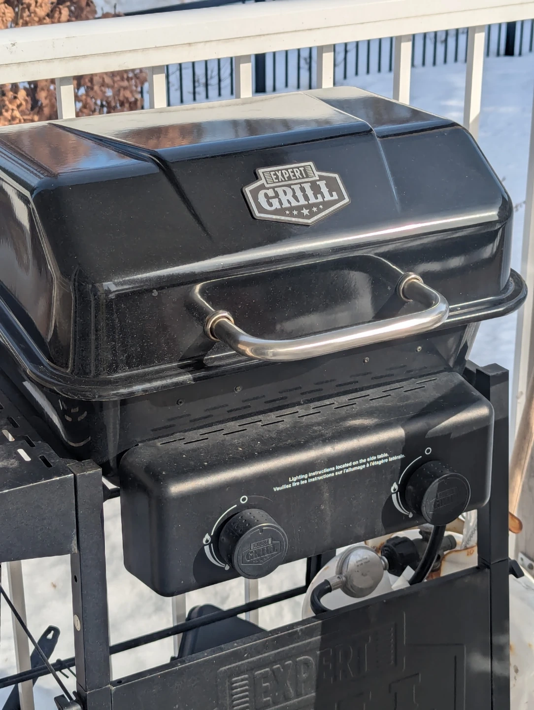This is a black Expert Grill propane barbecue. It features two burners and a sturdy metal construction. Lighting instructions are provided on the side table.