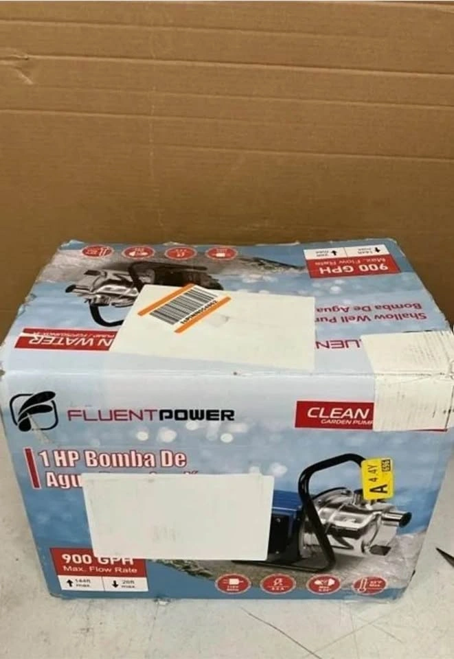 Brand new in sealed box. This FLUENTPOWER 1HP Portable Garden Transfer Pump moves 900GPH. It's an electric sprinkler booster pump, suitable for shallow wells, and designed for home lawn irrigation and water draining. A 13 ft suction hose kit is included.