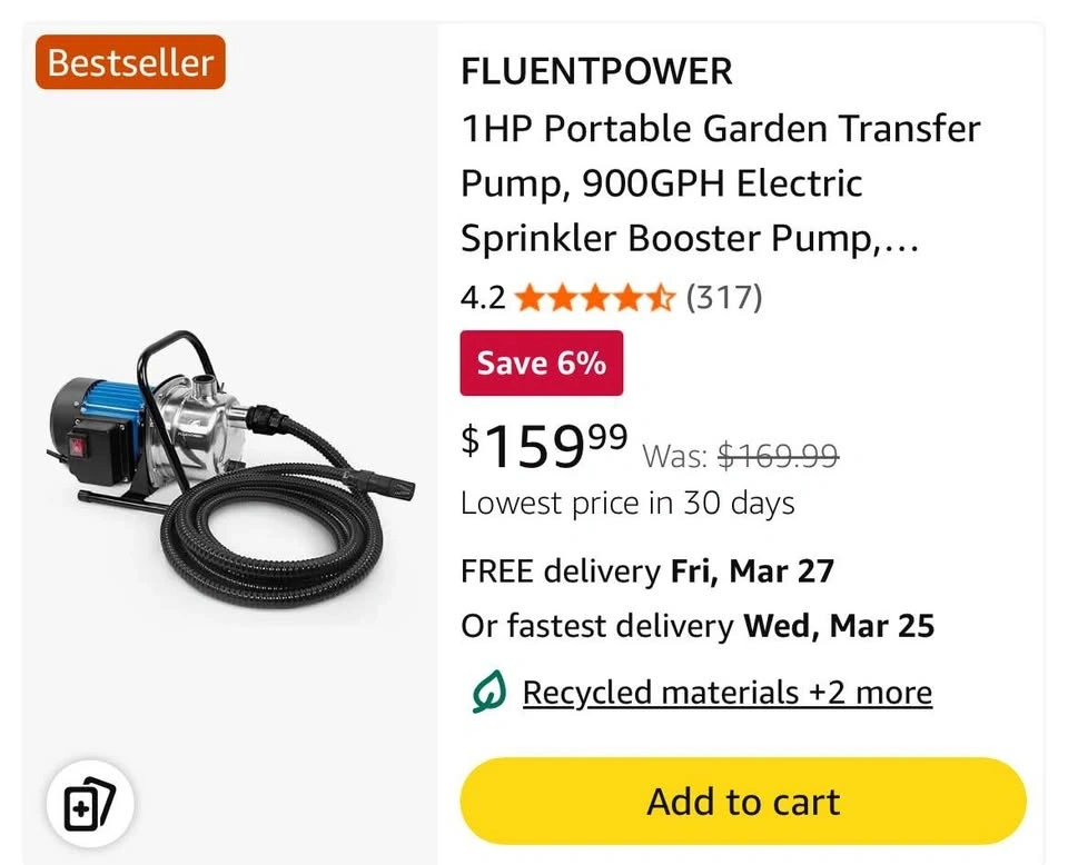 FLUENTPOWER 1HP Portable Garden Pump, 900GPH