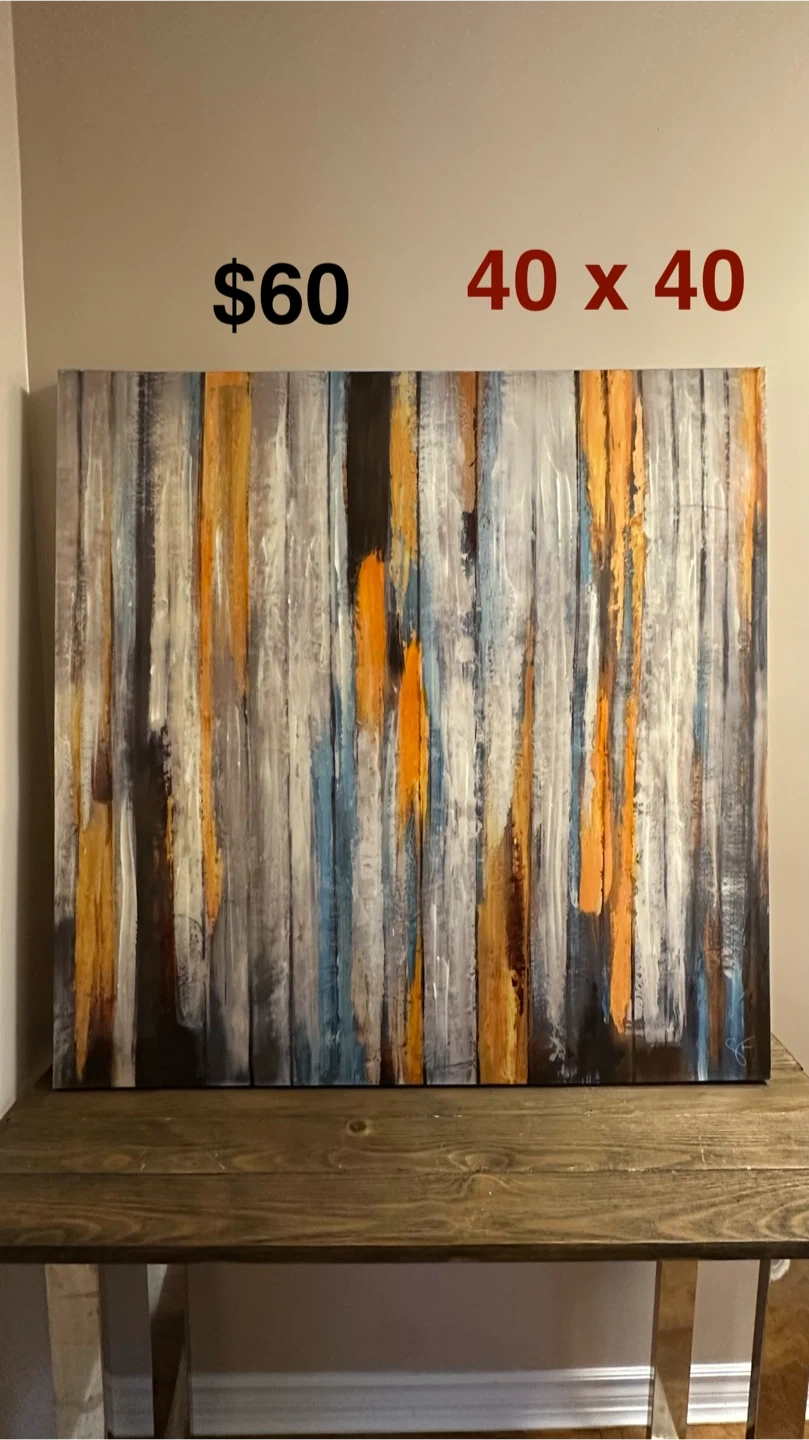 This abstract canvas art features vertical stripes in grey, white, blue, and orange tones. Glossy finish. It measures 40 inches by 40 inches. Adds a splash of colour to any room!