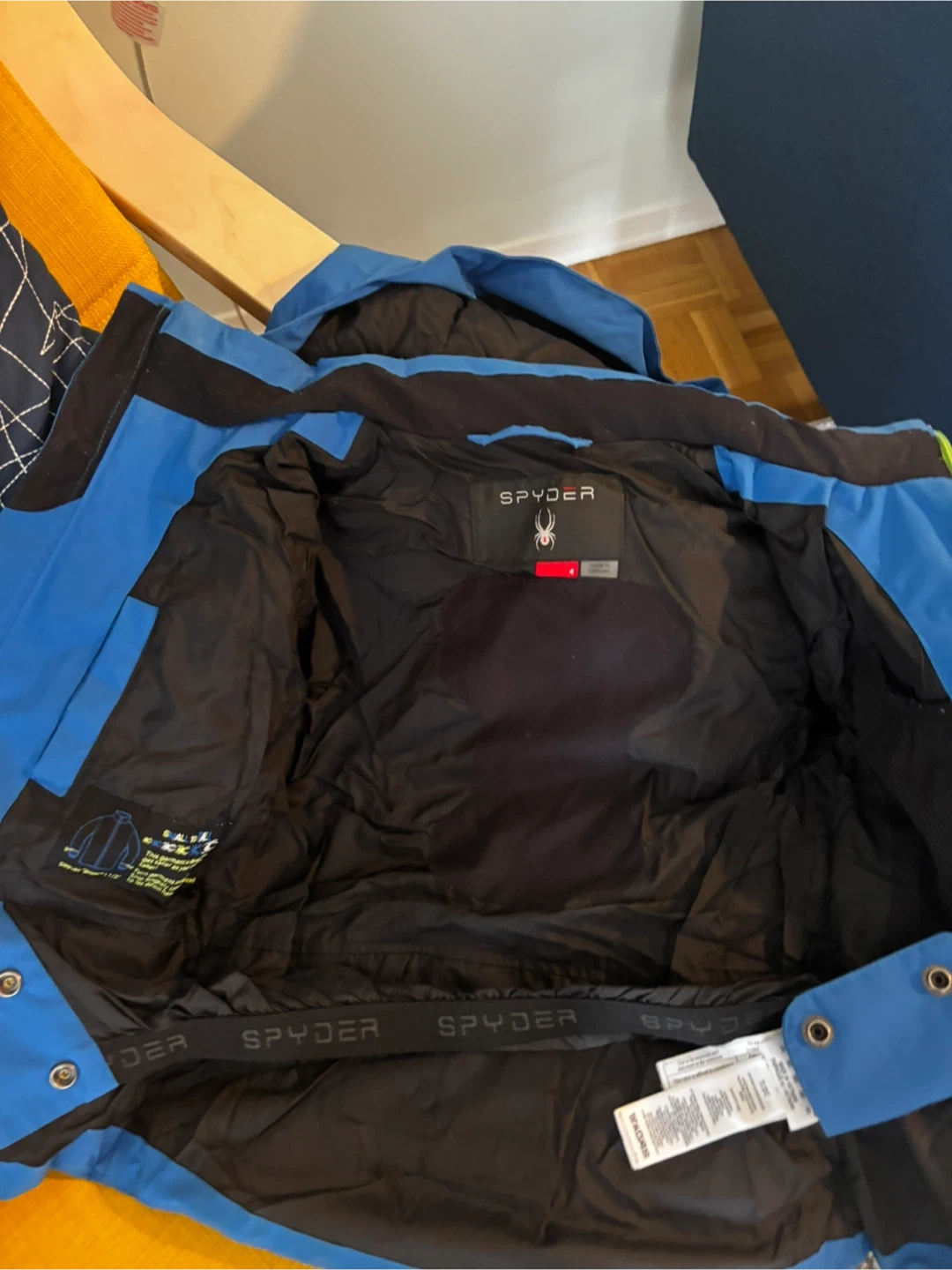 70Spyder boy's ski jacket in size 4. It's a vibrant blue colour with a contrasting yellow zipper! Perfect for keeping your little one warm on the slopes or during winter activities Puck it up only Cash only