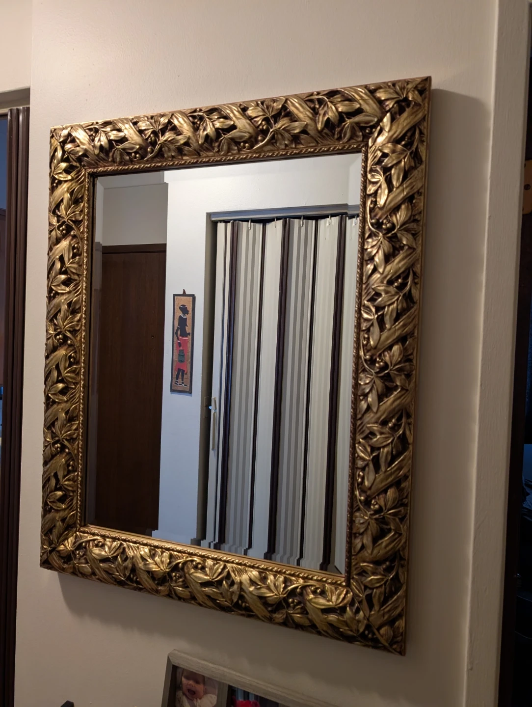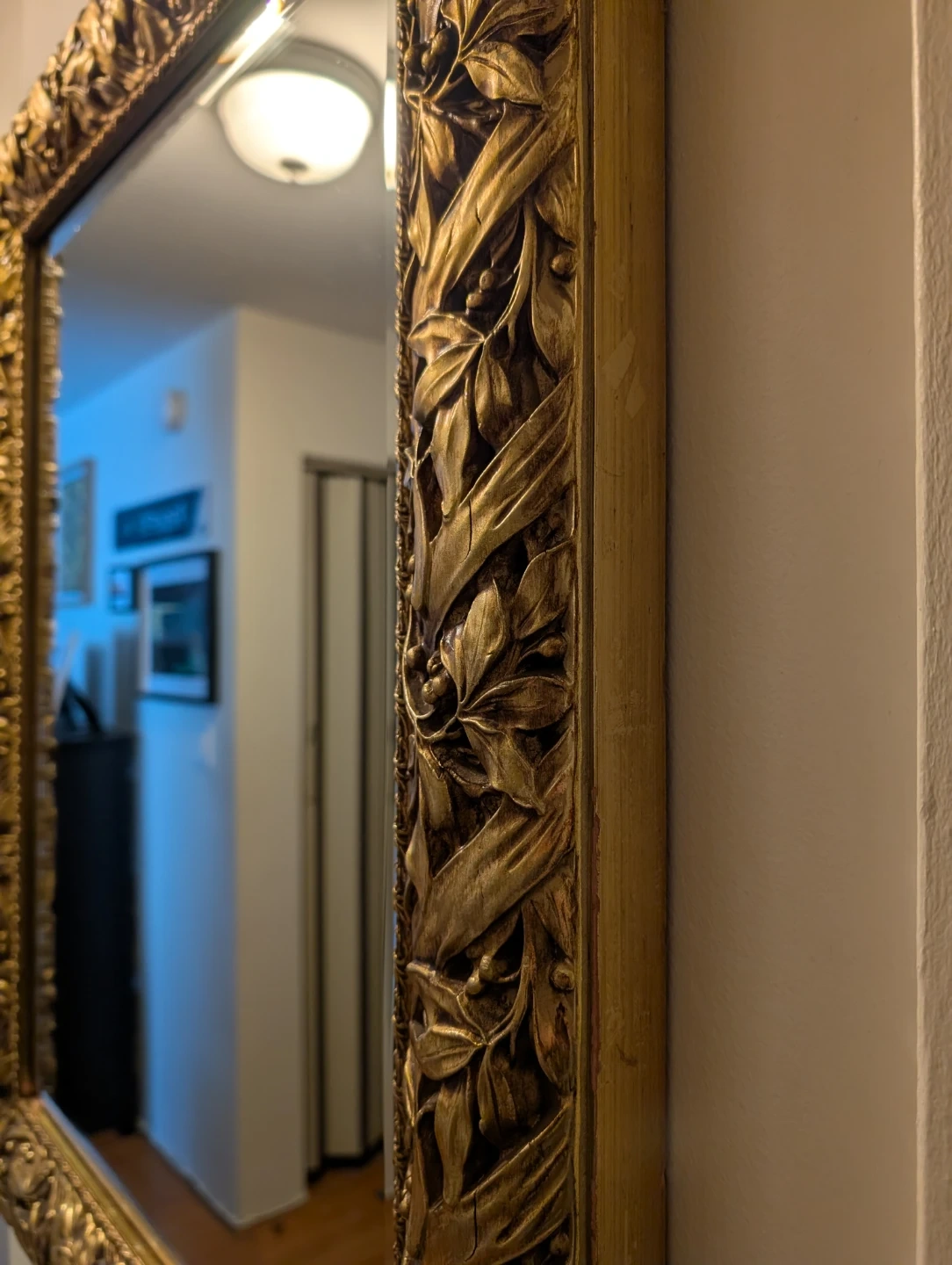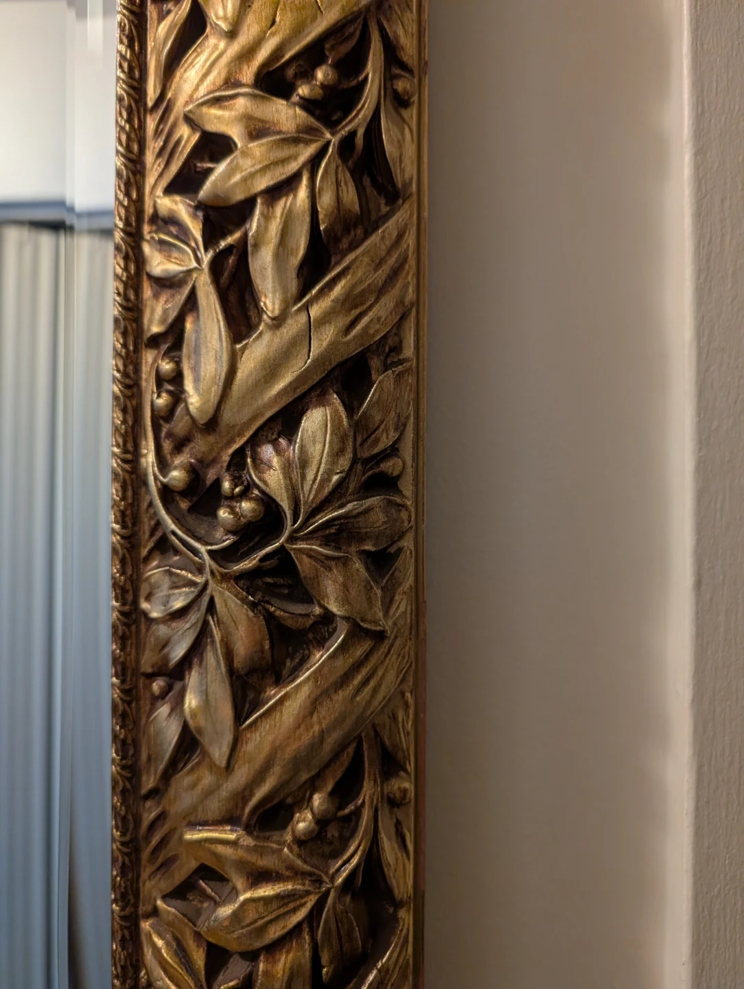This wall mirror features an ornate gold-tone frame with a detailed leaf and berry motif. It's a beautiful vintage accent piece that adds a touch of elegance to any room. The frame is made of wood with a metallic finish.