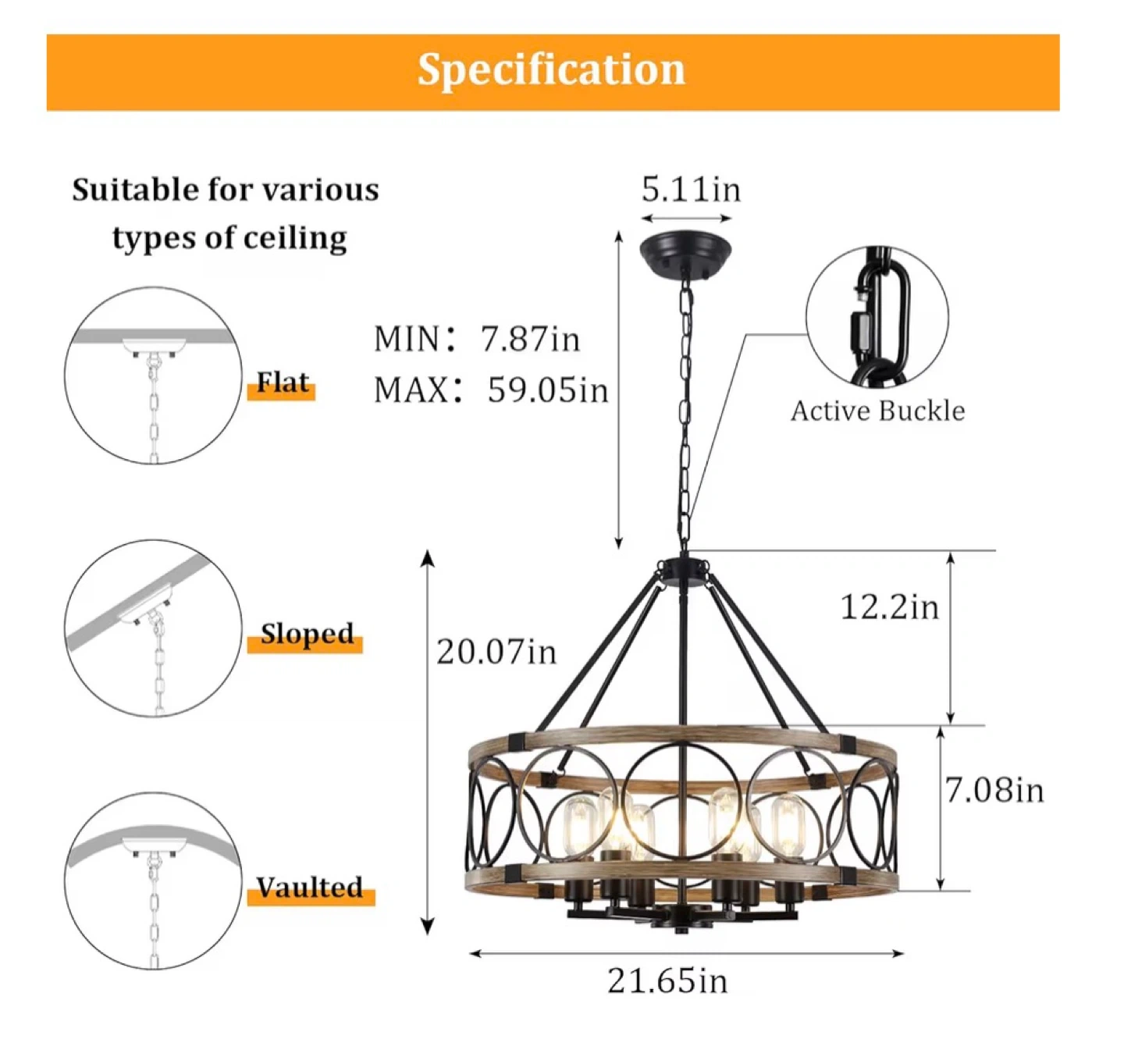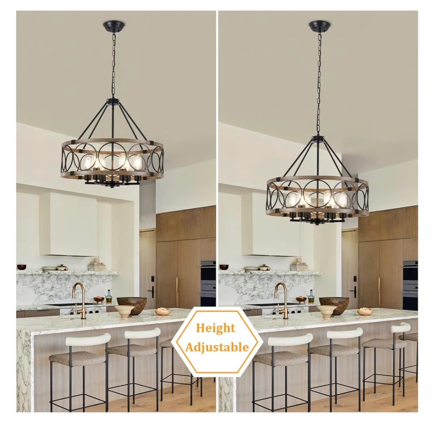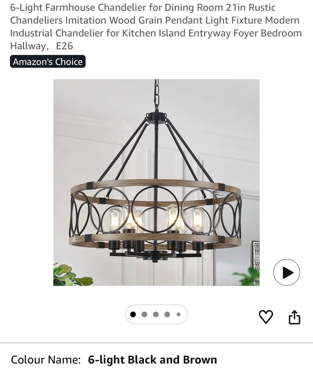 This farmhouse chandelier features a rustic wood grain finish with black metal accents and circular details. It's a 6-light fixture compatible with E26 bulbs and offers adjustable height for various ceiling types. The diameter is 21.65 inches and the fixture height is 7.08 inches.