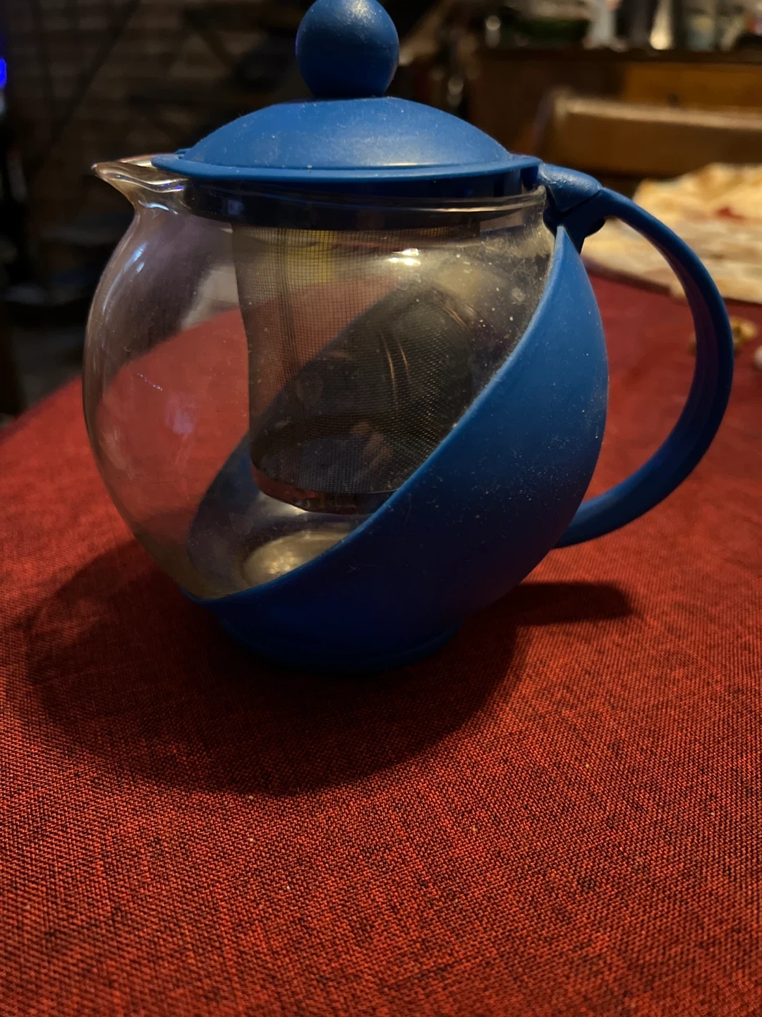 This is a glass teapot with a blue lid, handle, and protective wrap. It includes a mesh infuser for loose leaf tea. The clear glass body allows you to see the brewing process. This teapot is great for making your favourite teas.