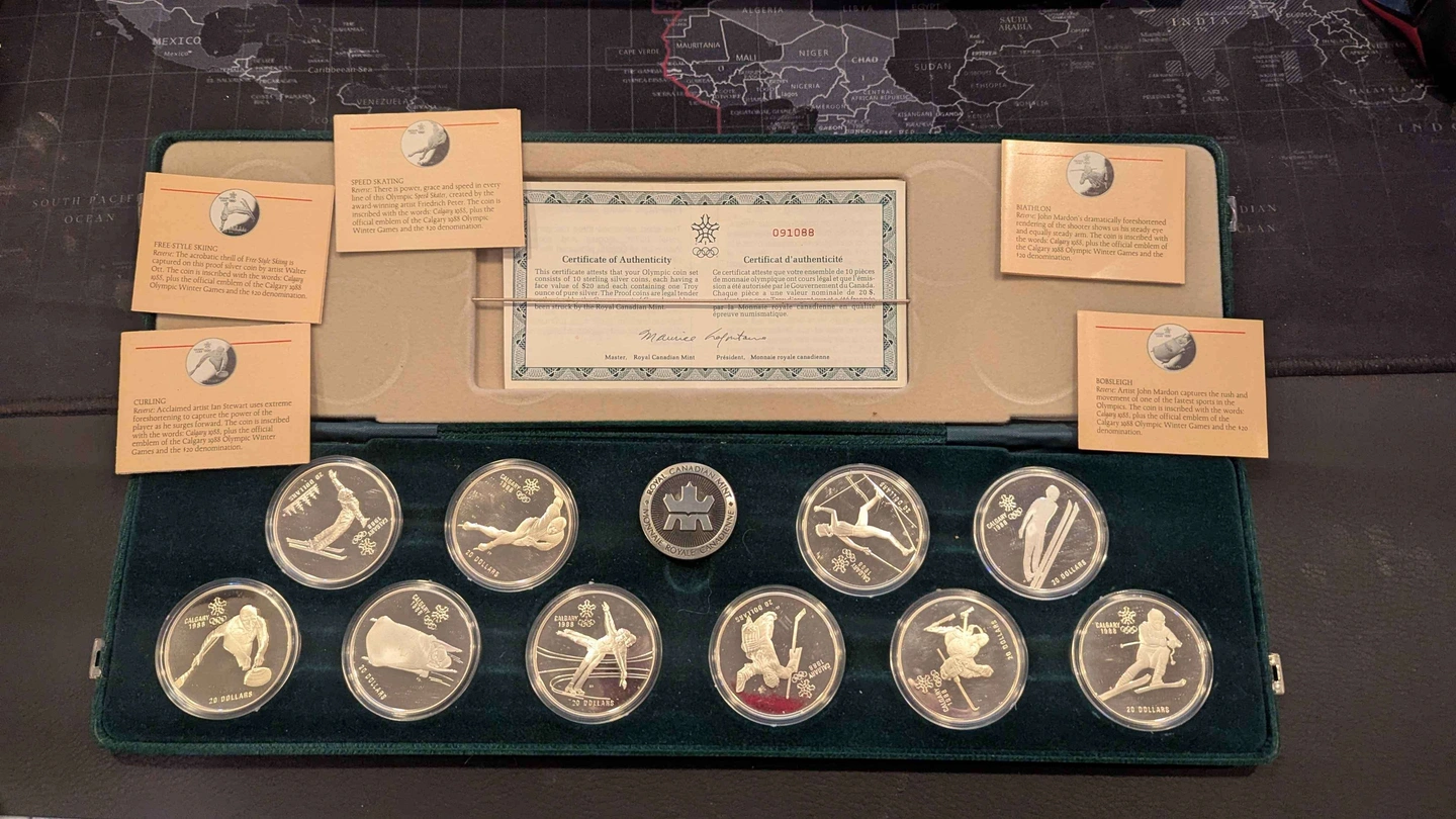 Issued to commemorate the XV Olympic Winter Games, each of these beautiful Silver coins features a brilliant design of an event held during the Calgary Olympics of 1988.