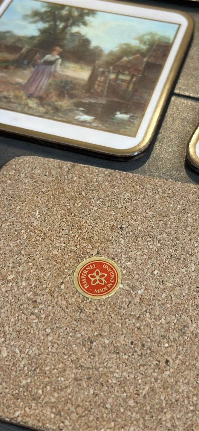 Lovely set of five cork-backed coasters, each featuring a different pastoral scene. Made in England, they're perfect for protecting your surfaces with a touch of vintage charm. Cork backing provides good grip and prevents scratches.