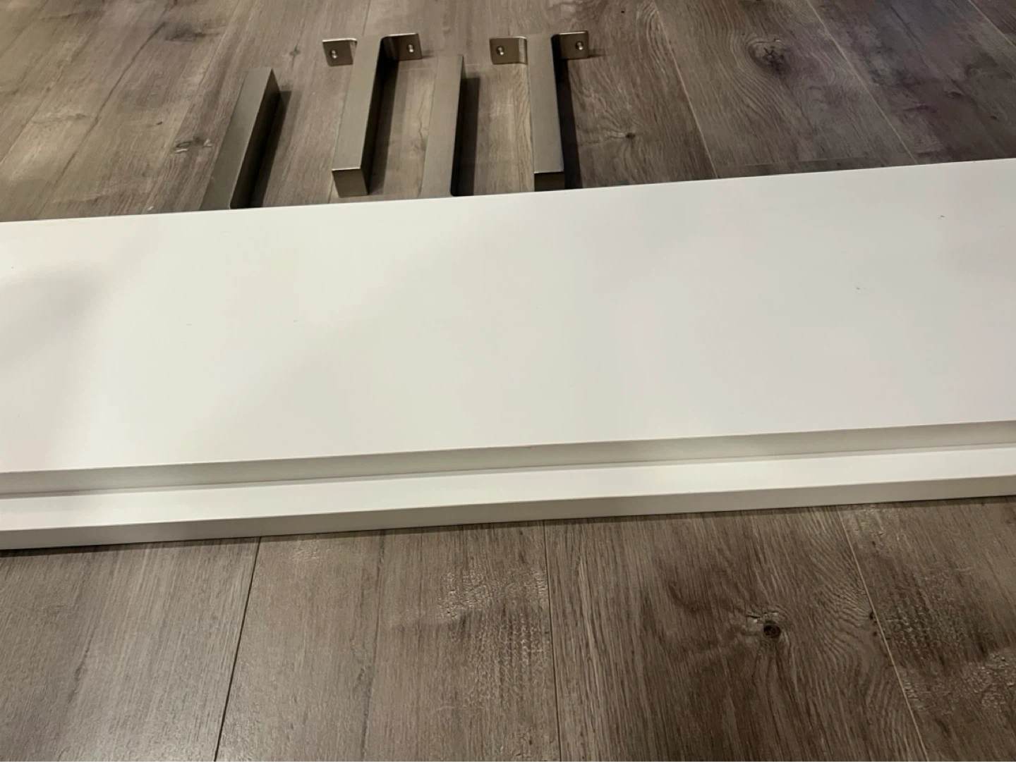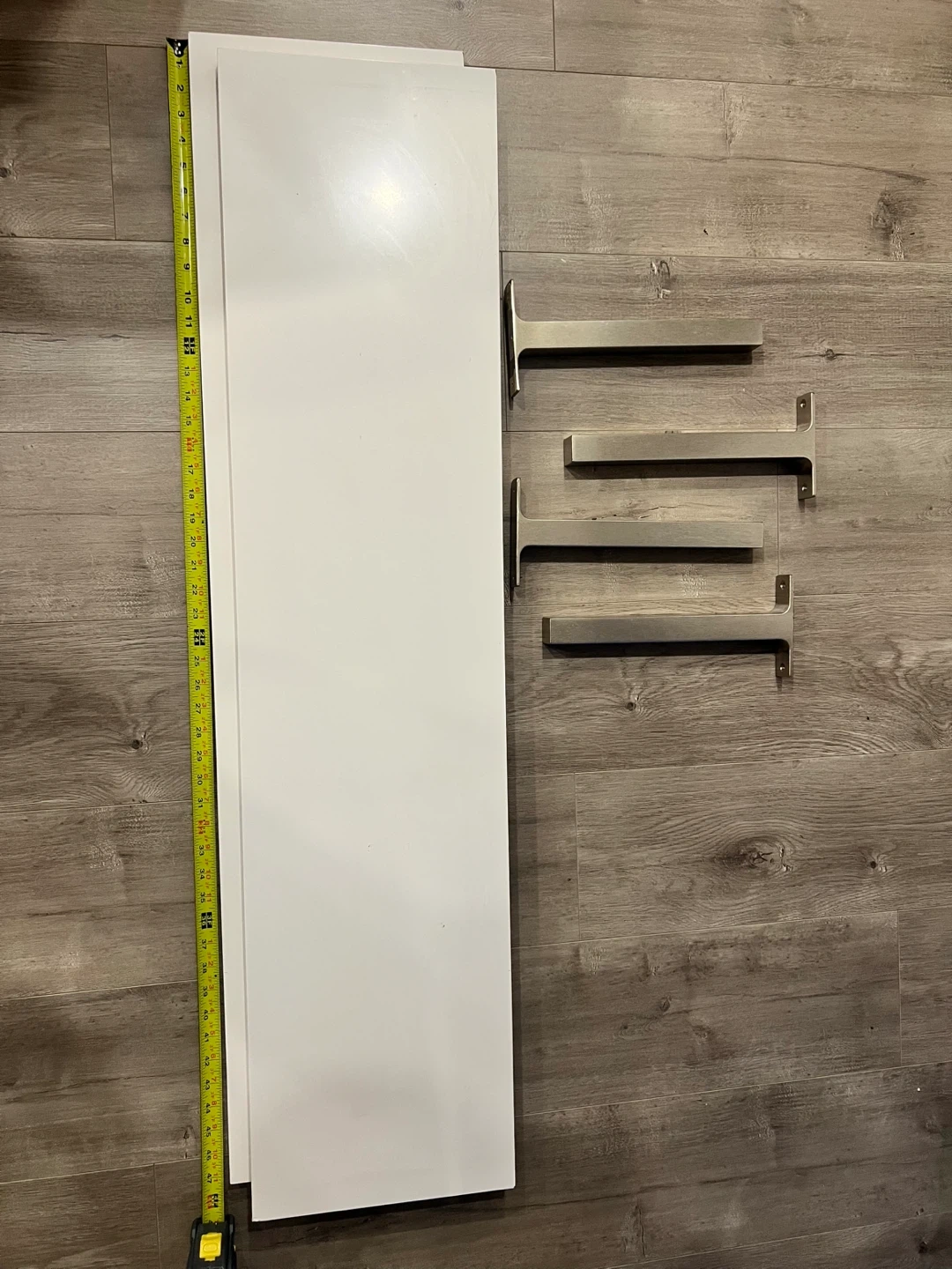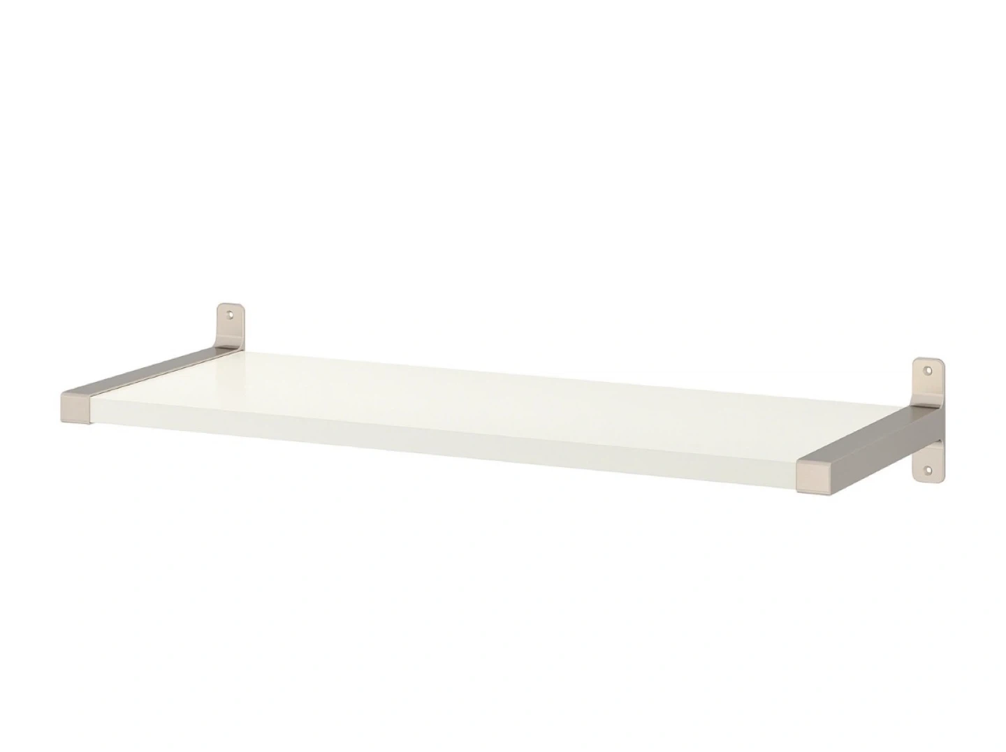 This is a white large IKea shelf with silver- brushed tone metal brackets. It's approximately 47 inches long/ 11 inch wide. Great for organizing your space!