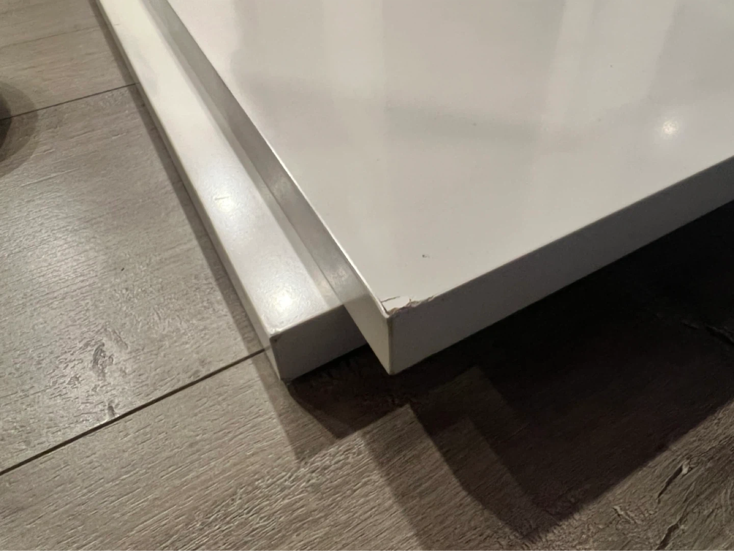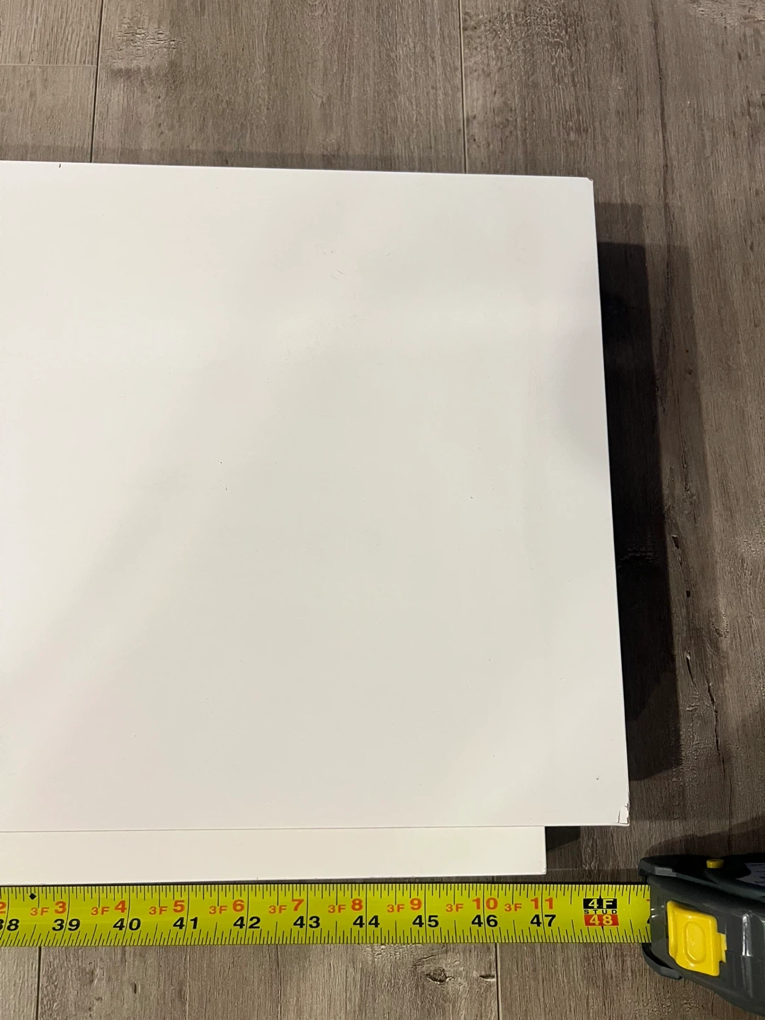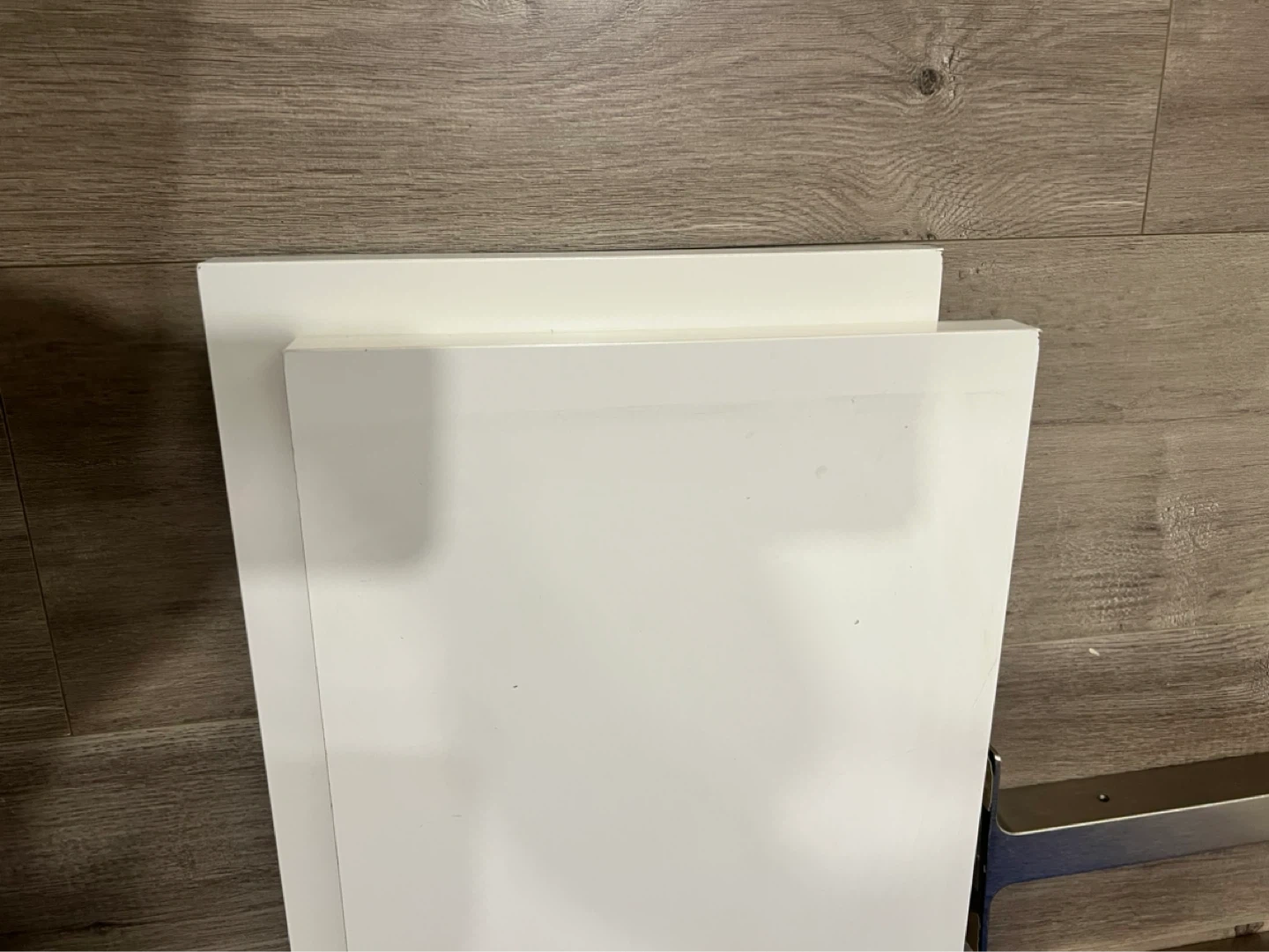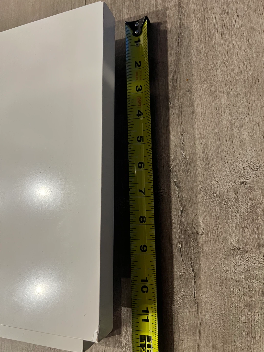This is a white large IKea shelf with silver- brushed tone metal brackets. It's approximately 47 inches long/ 11 inch wide. Great for organizing your space!