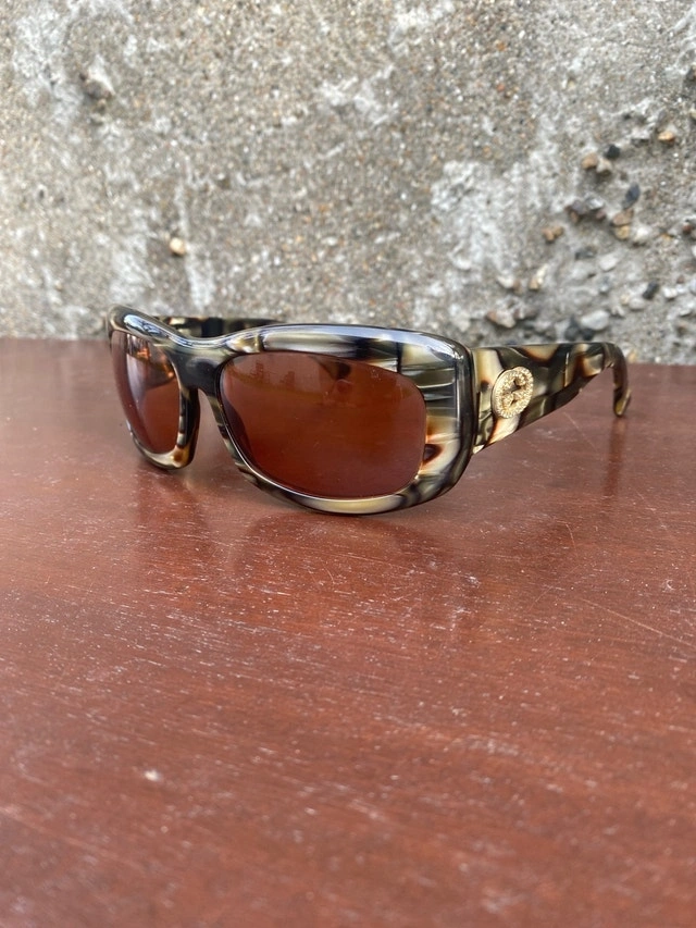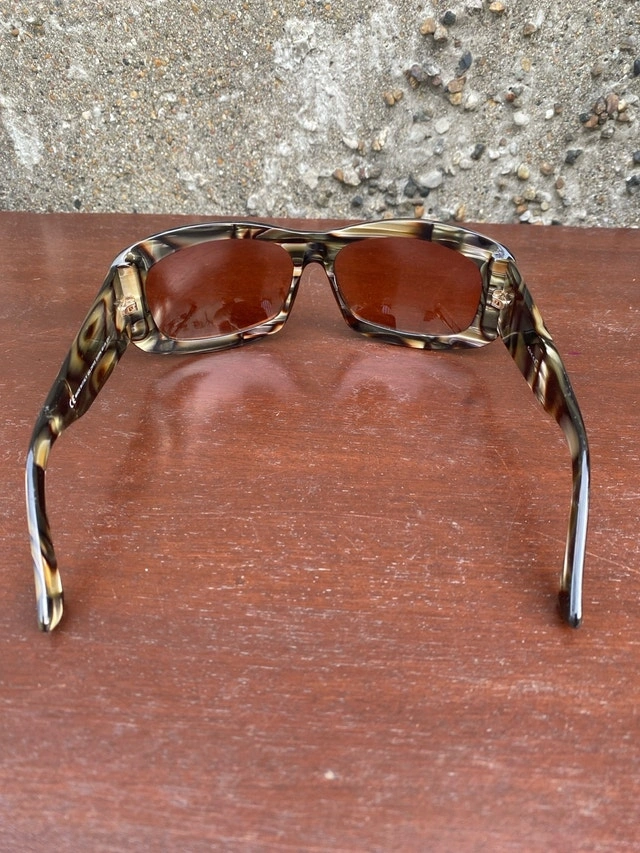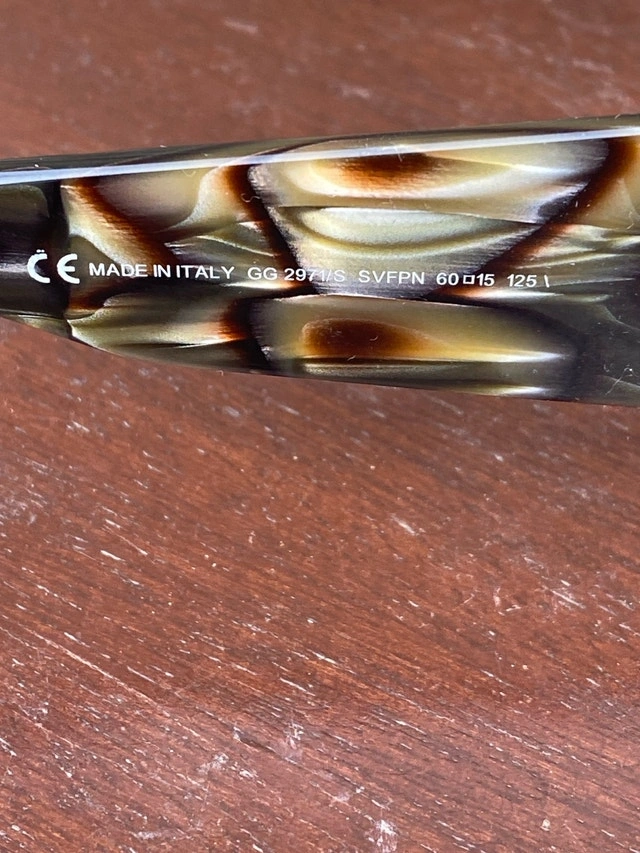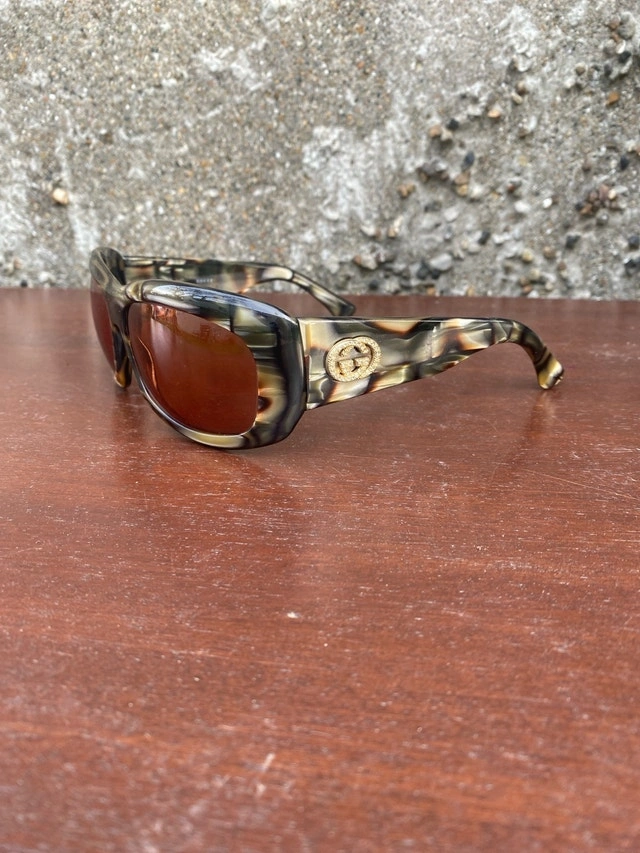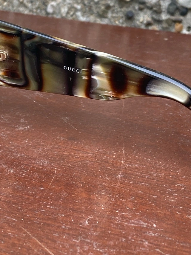 These stylish Gucci sunglasses feature a distinctive tortoise shell frame with gold accents. They are in used, good condition and offer excellent sun protection.