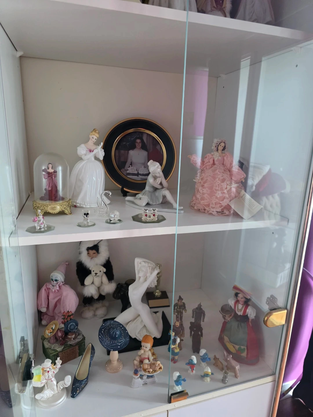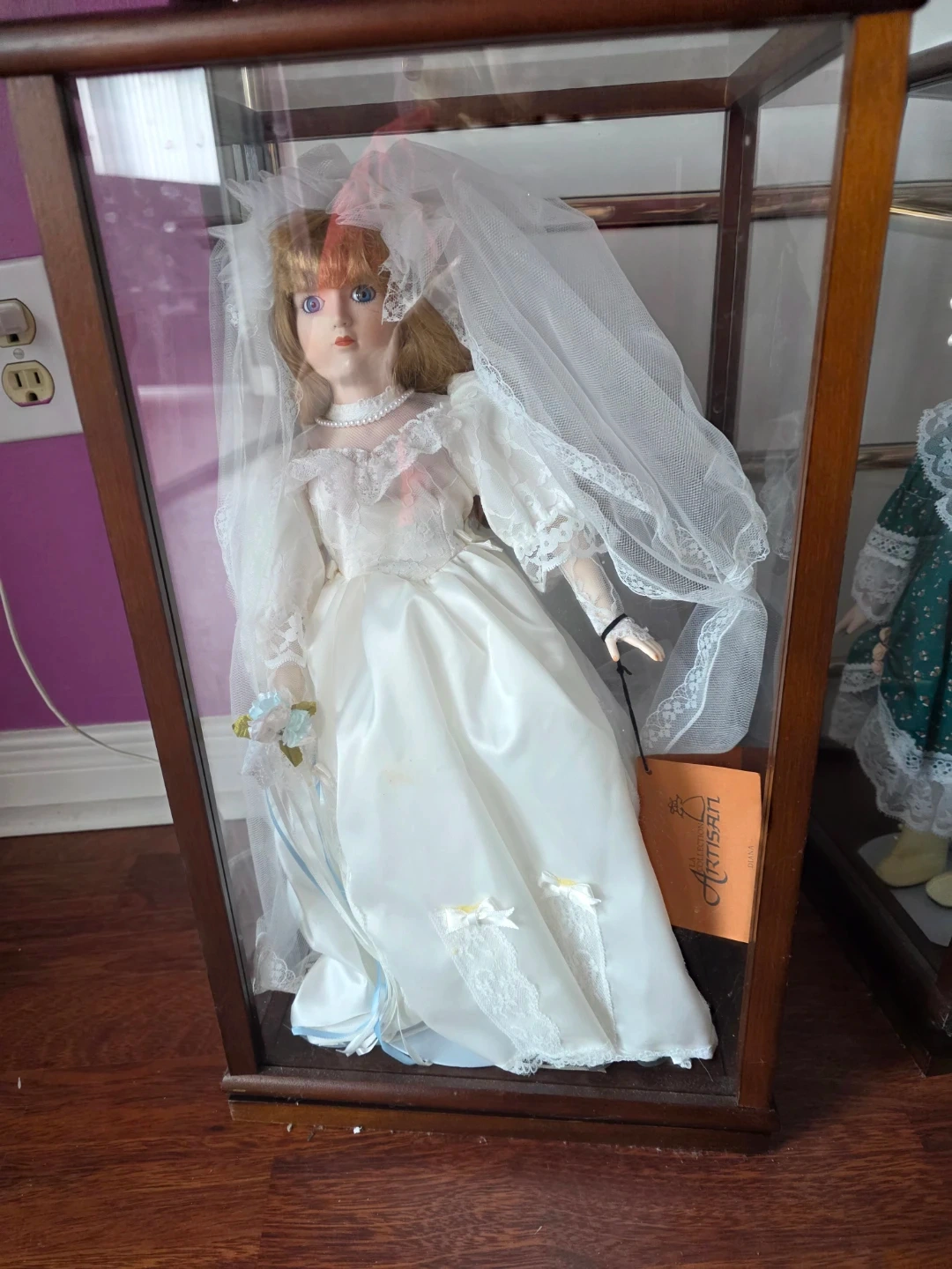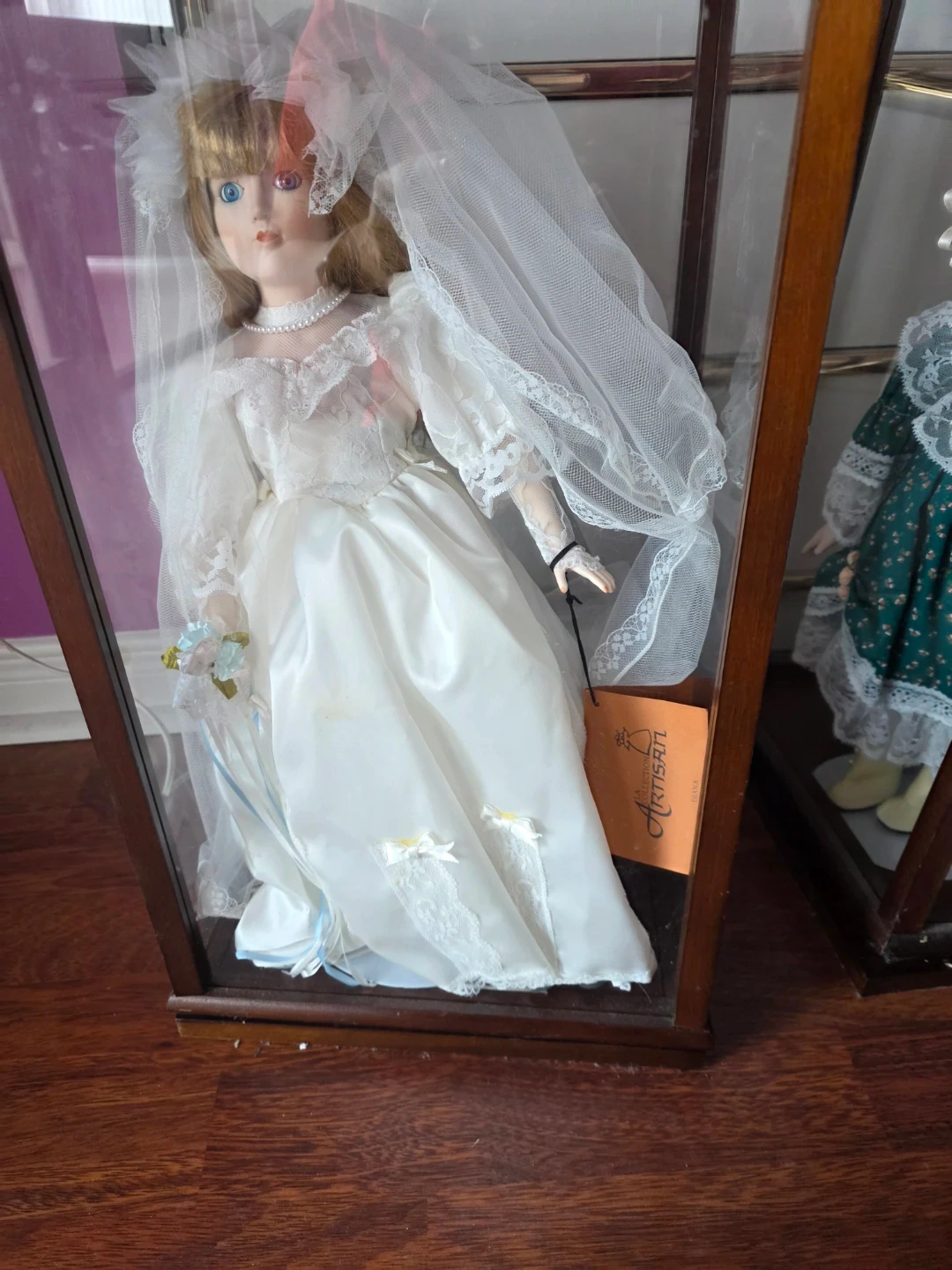 This is a collection of decorative dolls and figurines, perfect for display. Included are several porcelain dolls in vintage-style dresses and various small figurines. They're ideal for collectors or as decorative accents for a shelf.