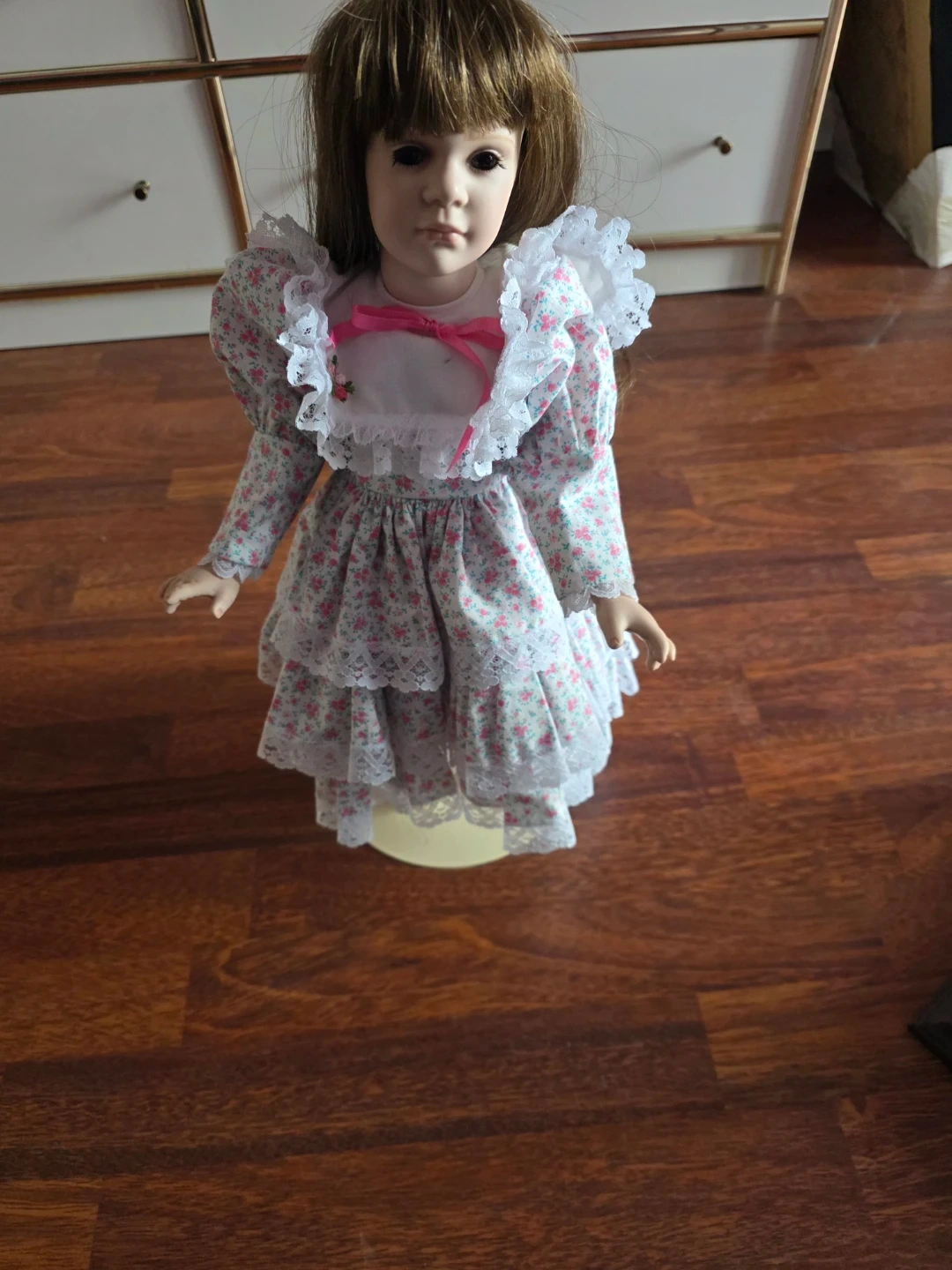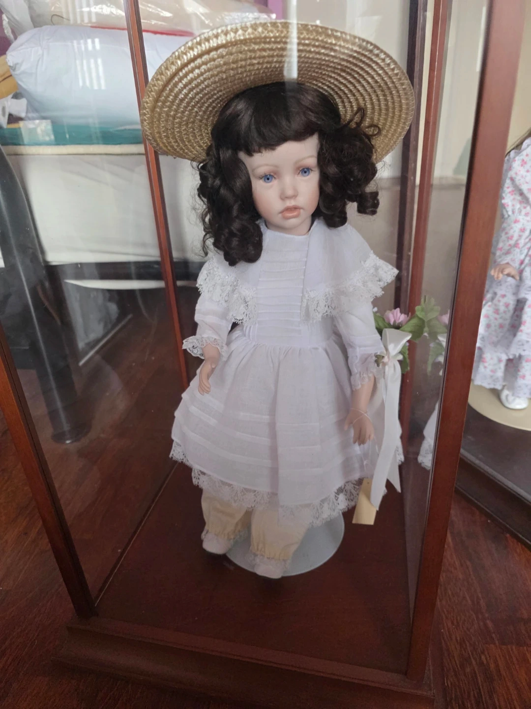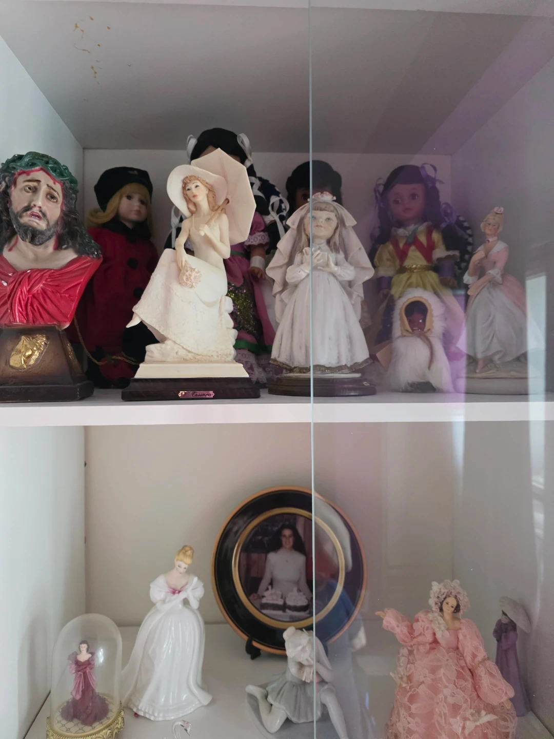 This is a collection of decorative dolls and figurines, perfect for display. Included are several porcelain dolls in vintage-style dresses and various small figurines. They're ideal for collectors or as decorative accents for a shelf.