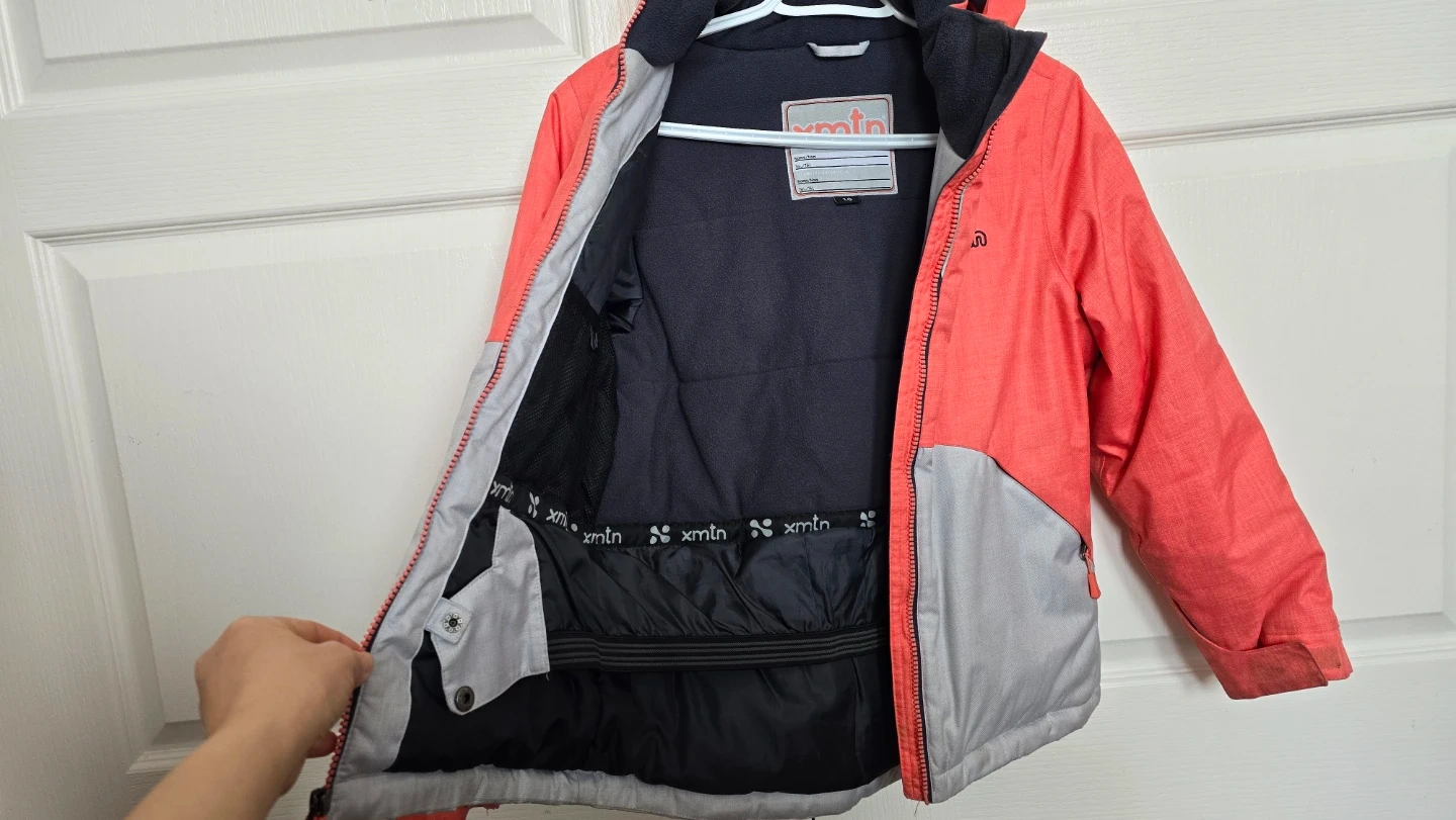 This X-Mtn ski snow jacket is designed for kids. It's a colourful coral and grey jacket with a hood. Features include a zip-up front and pockets.