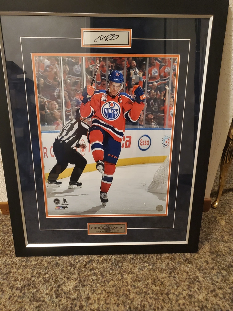 Framed photo of Connor McDavid. Autographed and features an Oilers jersey. Includes a certificate of authenticity. Great piece for any hockey fan!