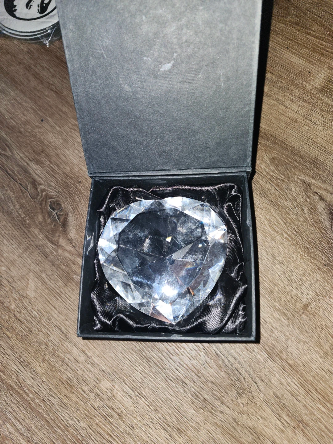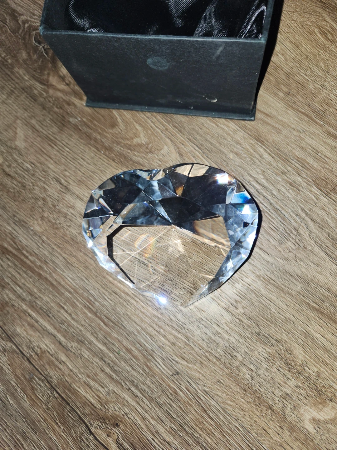 This sparkling heart-shaped crystal paperweight comes in its original box. It's made of clear crystal and has a beautiful faceted design. A lovely decorative piece!