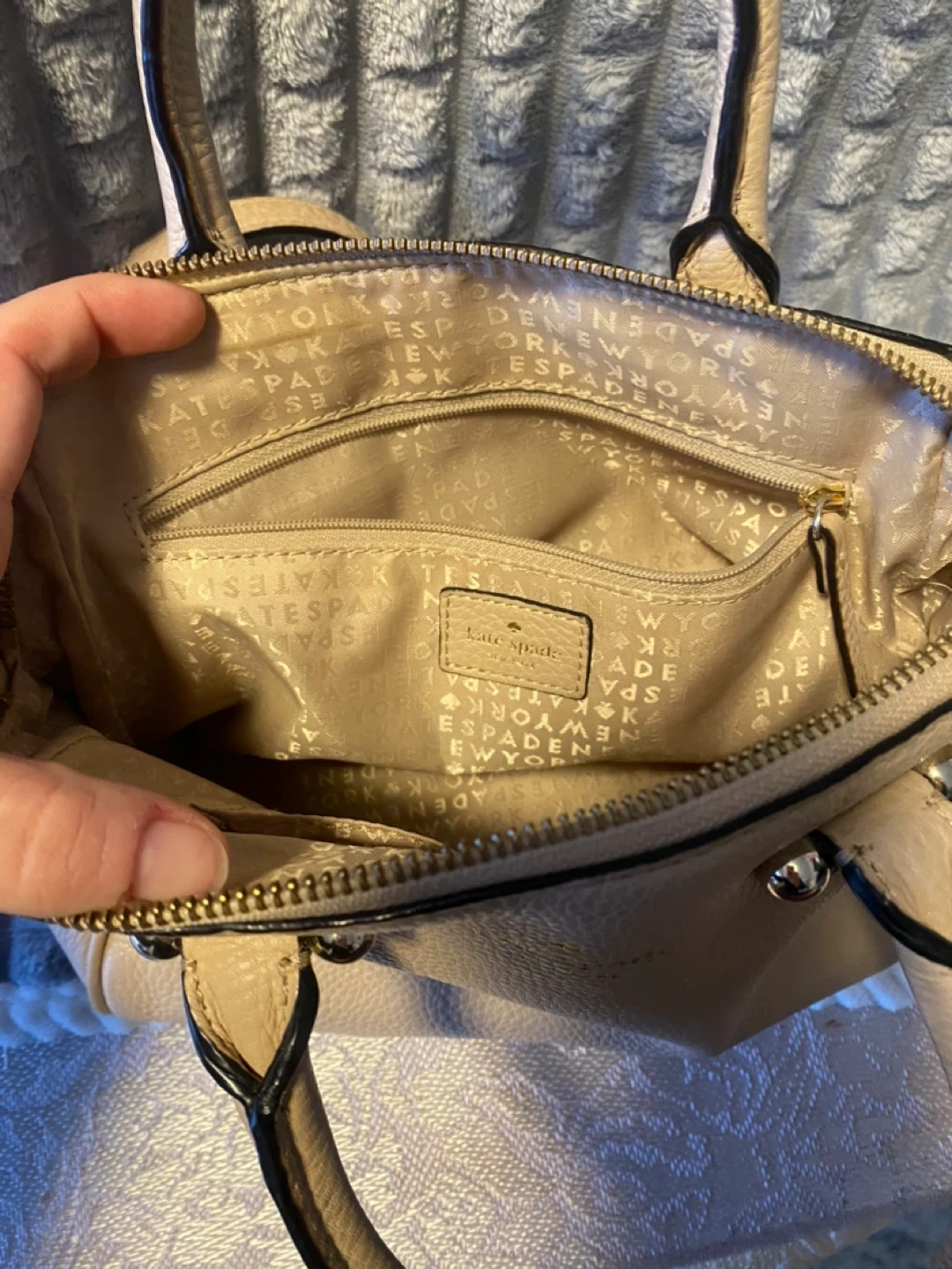 This is a pale beige Kate Spade satchel handbag. It's made of genuine leather and includes a removable shoulder strap. The interior features a zippered pocket and slip pockets for organization.