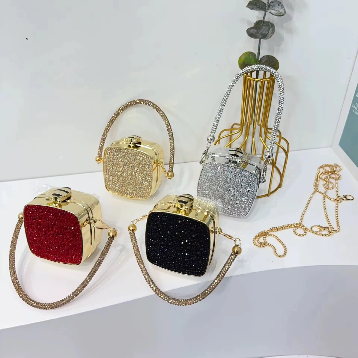 67Check out these adorable square rhinestone clutches! They come in four colours: gold, silver, red, and black. Perfect for a night out or special occasion. Each clutch has a sparkly rhinestone handle and an additional gold chain.